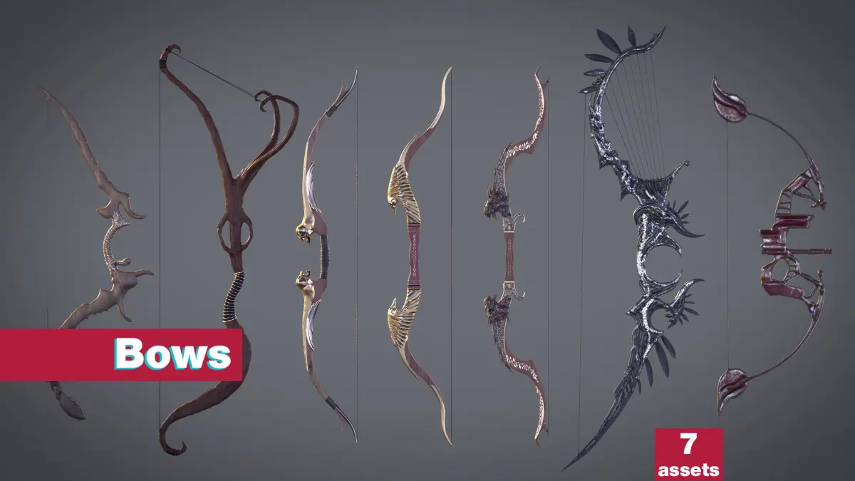 A collection of intricately designed fantasy-style bows, arrows, and crossbows. Each asset has a unique aesthetic, combining organic, mechanical, and artistic elements.First Bow: A sleek, curved design resembling a natural or bone-like structure. It has ridges and a spine-like texture, suggesting an organic theme.Second Bow: A natural wood-themed bow with dramatic curves. It has a simple but elegant design with a twisted and organic shape.Third Bow: A bow with a combination of metallic and natural elements. It features a bird-like motif, with golden and silver textures on the limb edges, resembling wings or feathers.Fourth Bow: Similar to the third bow, but with a more pronounced golden wing design on both sides, complemented by reddish accents along the grip and limbs.Fifth Bow: A rough, beastly design, with gnarled textures and a dragon-like or rock-like aesthetic. The darker color palette contrasts with the others.Sixth Bow: A gothic-inspired bow with an elaborate spiked design and crescent moon motifs. The structure is metallic and decorative, evoking an ominous and sinister tone.Seventh Bow: A futuristic or mechanical bow with a streamlined, almost cybernetic design. It has angular components and a metallic red finish, suggesting a modern or sci-fi origin.Each bow appears highly stylized, designed for a fantasy or creative visual context.