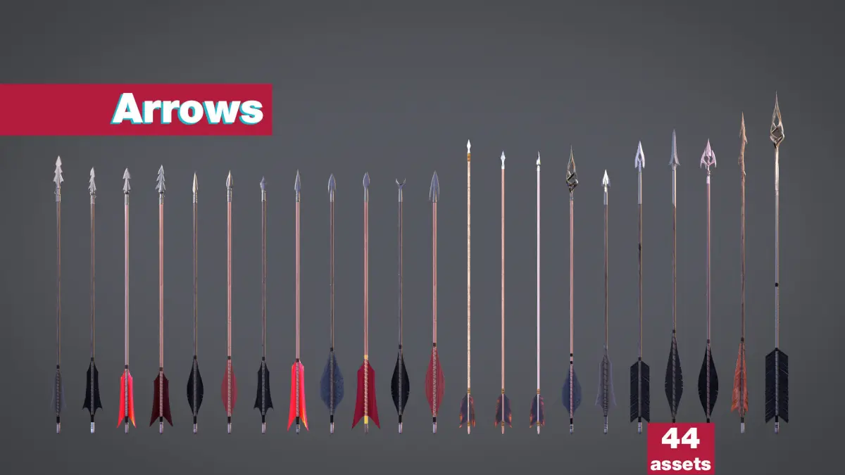 Arrows and Bolts (44+3 assets)A large array of projectiles designed for the bows and crossbows in the collection.