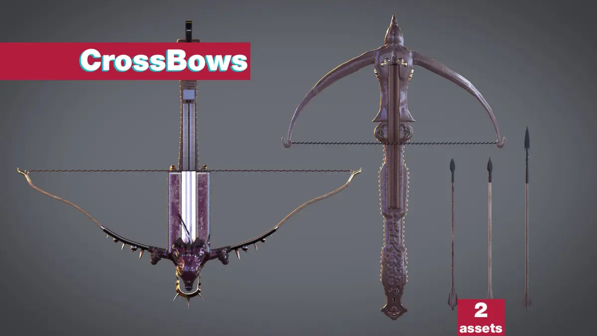 Crossbows (2 assets)Left Crossbow:Ornate with a curved, ivory-colored body.Decorated with elegant carvings and a polished finish, suggesting ceremonial or royal usage.