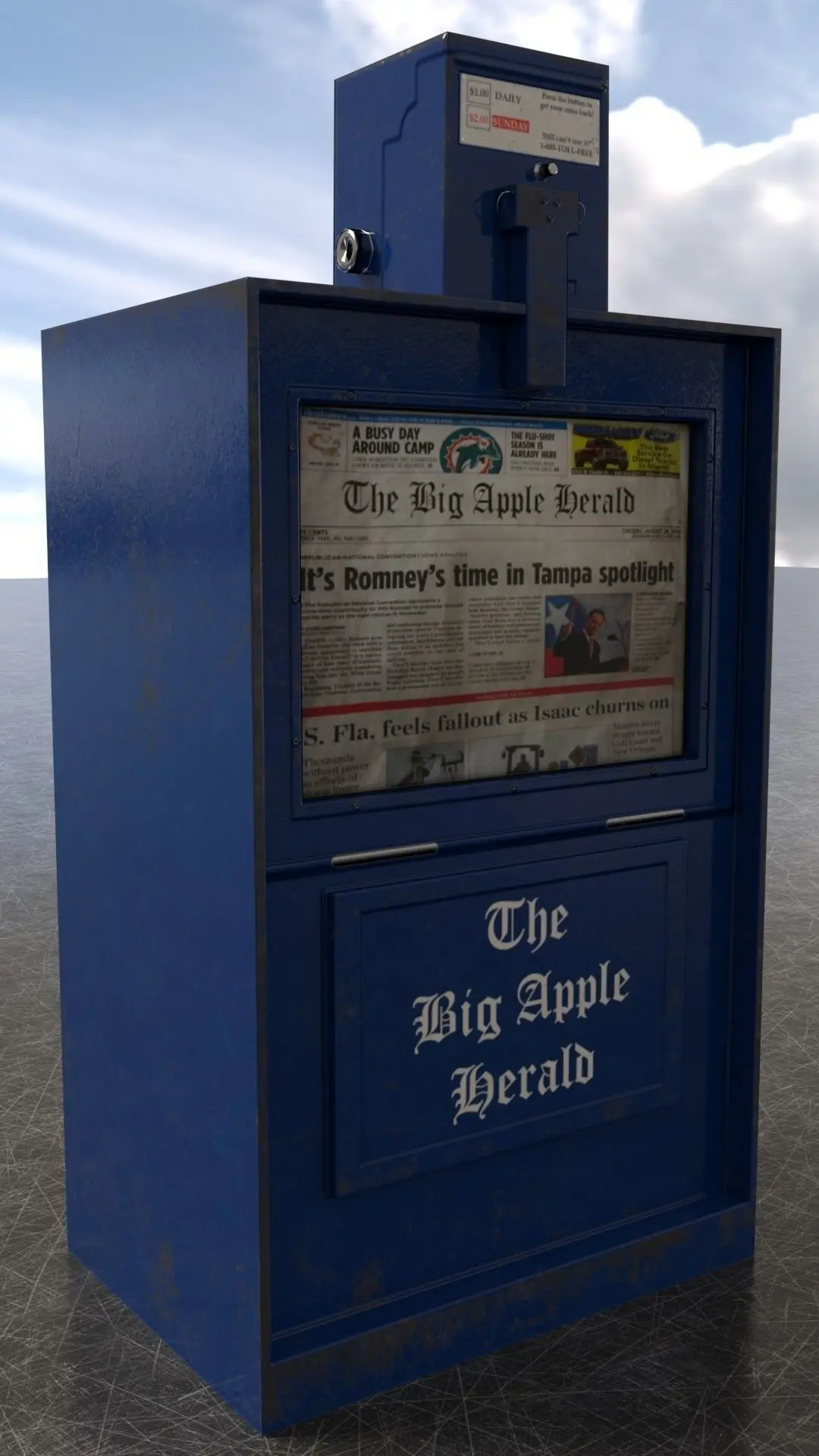 A collection of 3 different, high-quality textured newspaper vending machines. They are low-poly, ready to be used in any current-gen game engine, and they come with PBR texture maps. The polygon count indicated on the page is the sum of all 3 machines together.