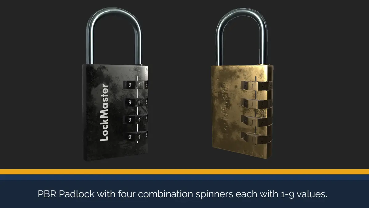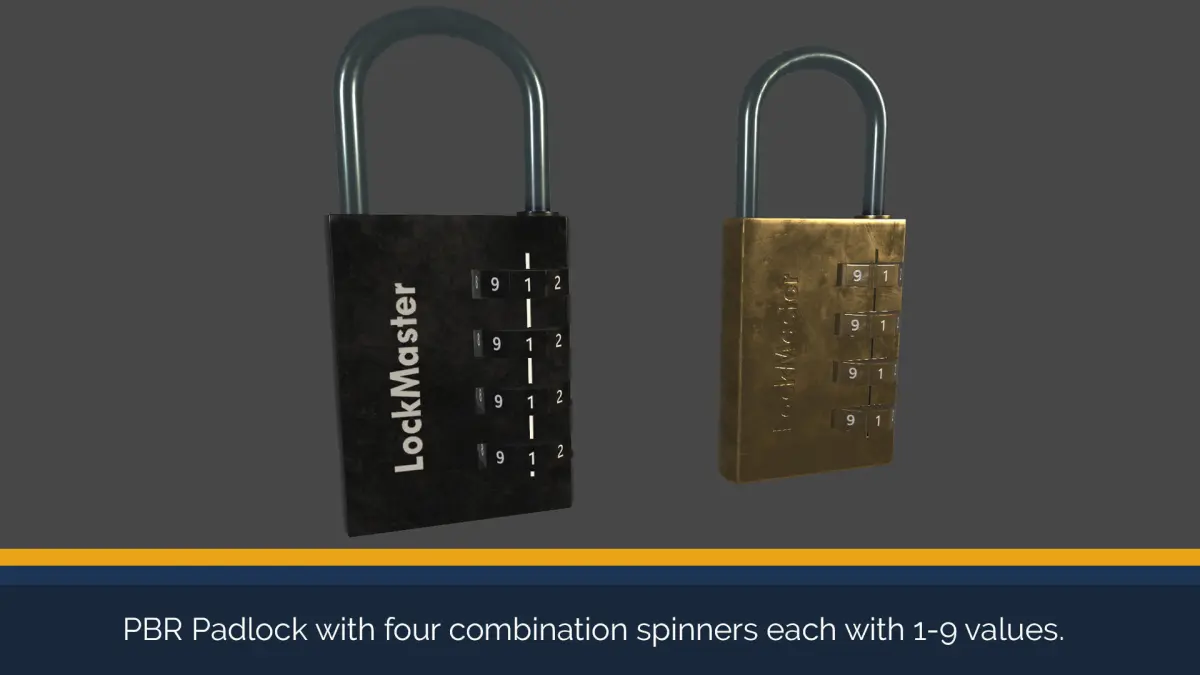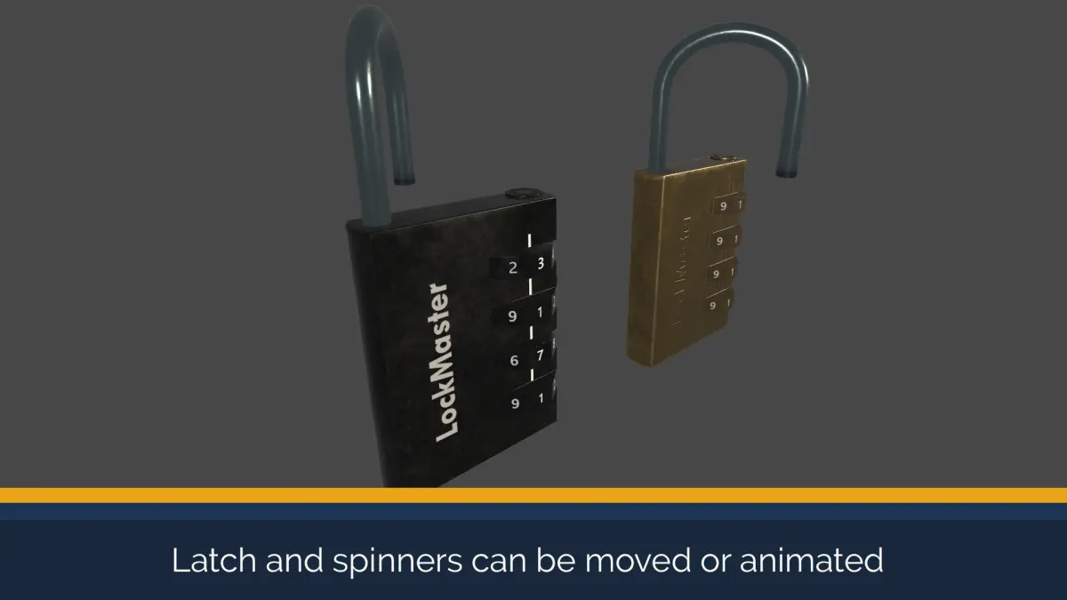 This Padlock Model Pack is a PBR asset with high resolution textures, low polygon counts of a padlock; which has seperate materials for brass and black variations. The package includes a hinged latch and 4 spinners, that could be animated. You can use this model for interactions similar to my Padlock Puzzle System