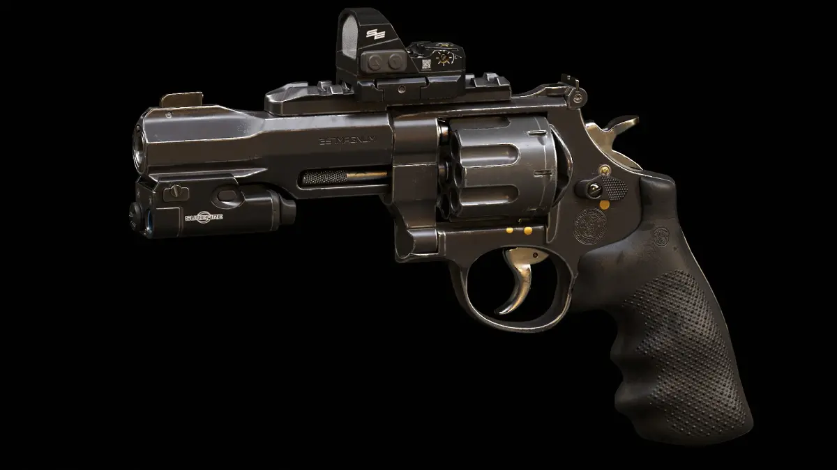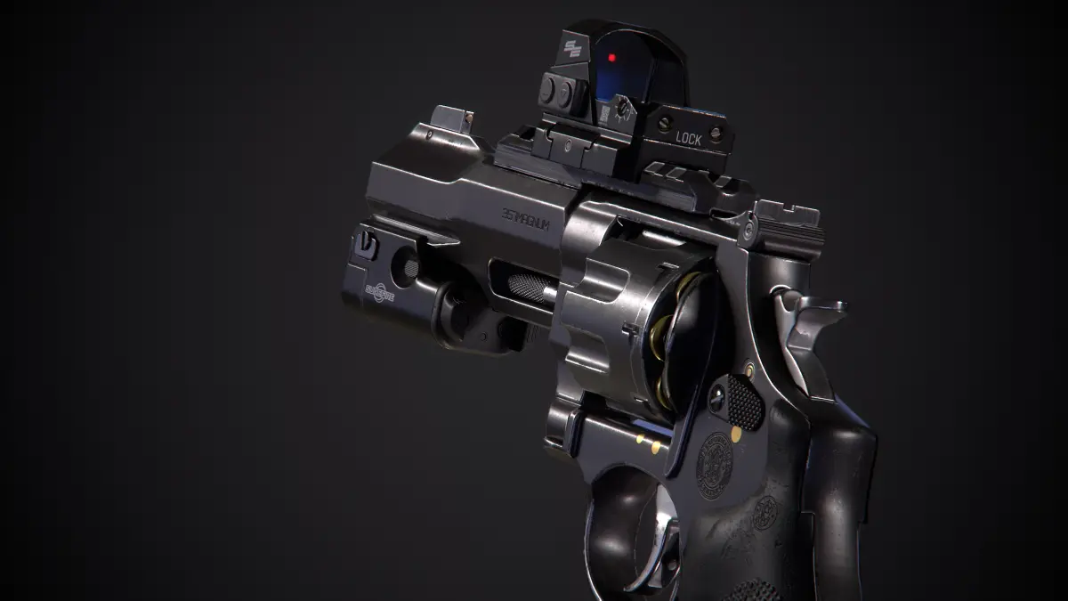 Accessories: Equipped with a red dot sight and tactical light, adding versatility and detail.