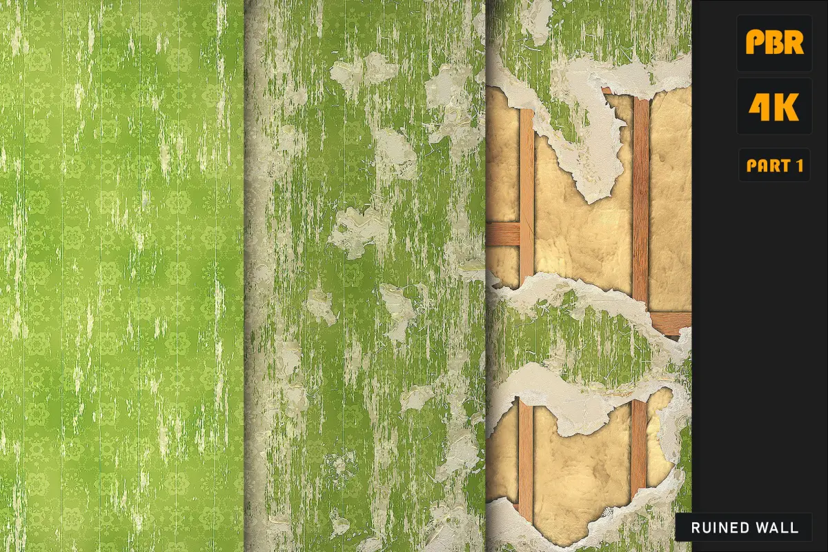 The package includes tiled textures for ruined walls for texturing walls indoors.