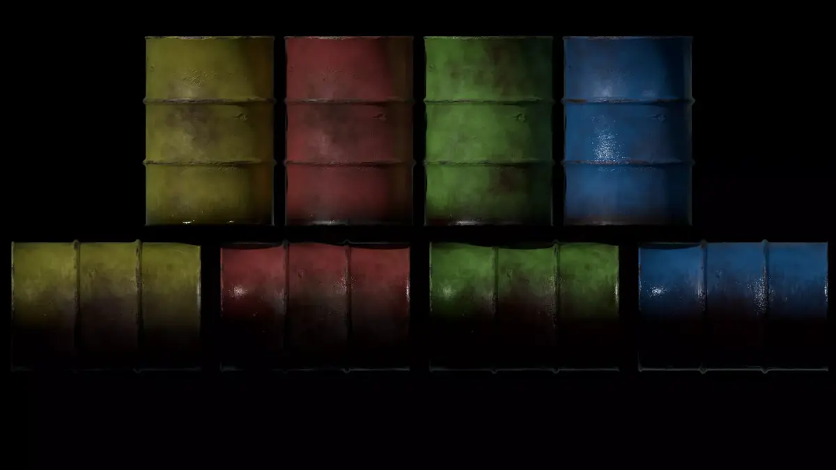 This is a high-quality, realistic game-ready rusty metal barrel asset pack including multiple color and variation options.