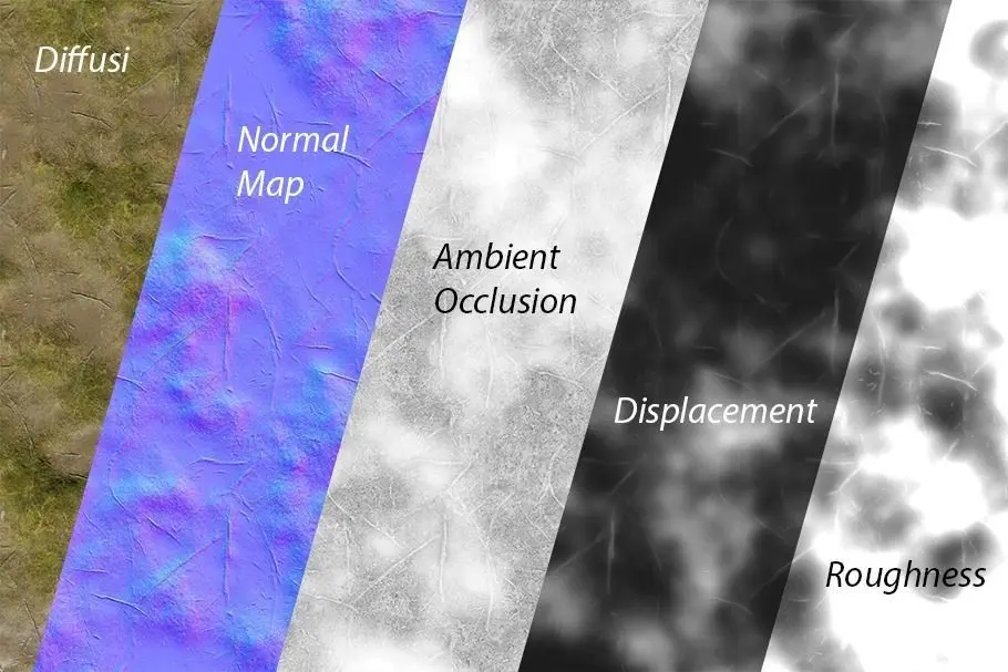- Diffuse, Normal map, Displacement, Specular, Roughness, Ambient Occlusion