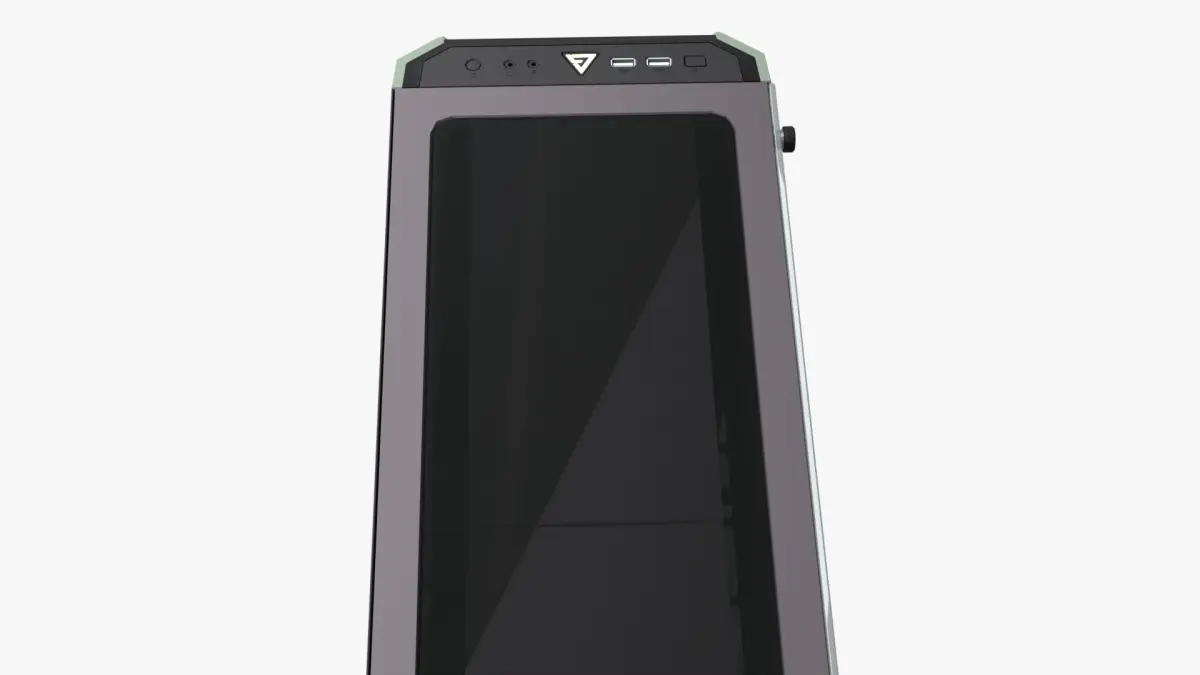 This is a highly detailed 3D model of a futuristic PC case, perfect for visualization, rendering, and prototyping projects. The design features a sleek, modern aesthetic, with a glass side panel, sharp geometric shapes, and integrated LED lighting details that exude a cutting-edge, tech-forward look.