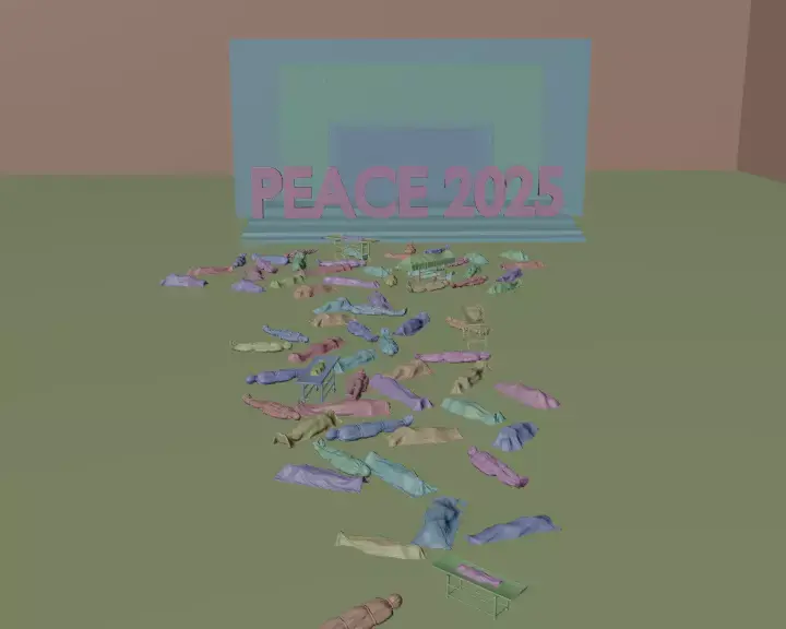 Description:“Peace 2025” is a dramatic 3D artwork created in Blender using Cycles render engine.The scene contrasts the word PEACE with a background of destruction and covered human forms — a powerful metaphor for the world’s contradictions, where peace is often spoken of amid violence and loss.