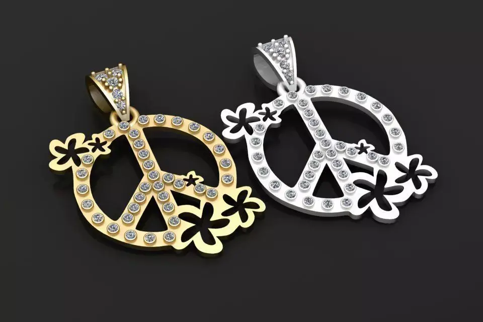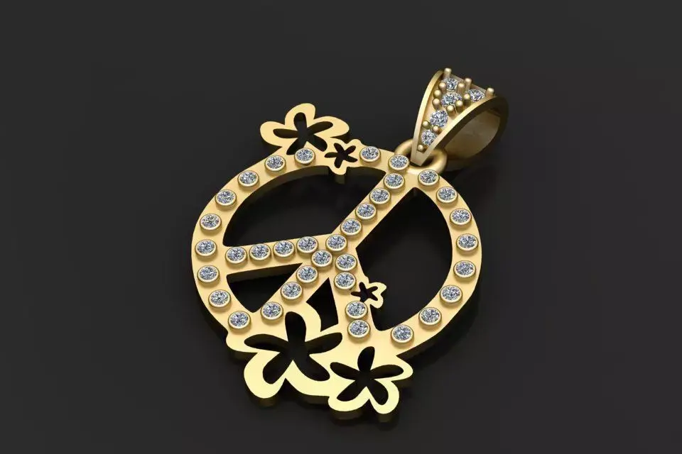 This is a stunning gold pendant featuring the iconic peace symbol, elegantly accented with floral cutouts for a touch of playfulness and harmony. The pendant is lavishly adorned with perfectly set round-cut white gemstones along the outer rim, inner lines, and the bail, giving it a radiant sparkle from every angle. The combination of the peace sign and floral motifs creates a design that is both timeless and symbolic, representing love, unity, and tranquility. Ideal for everyday wear or as a meaningful gift, this pendant seamlessly blends luxury with a heartfelt message.
