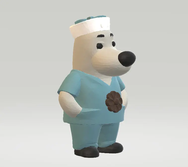 This is a charming 3D model of a cartoon polar bear nurse, designed with a friendly and approachable look. The character features a large round nose, expressive eyebrows, and simple facial details that make it perfect for children's content, educational games, medical apps, or animated healthcare presentations. Dressed in light blue scrubs with a nurse cap and holding a flower emblem on its chest, the model exudes a warm and caring vibe. The low-poly design ensures smooth performance for mobile games, VR, AR, and real-time rendering applications.