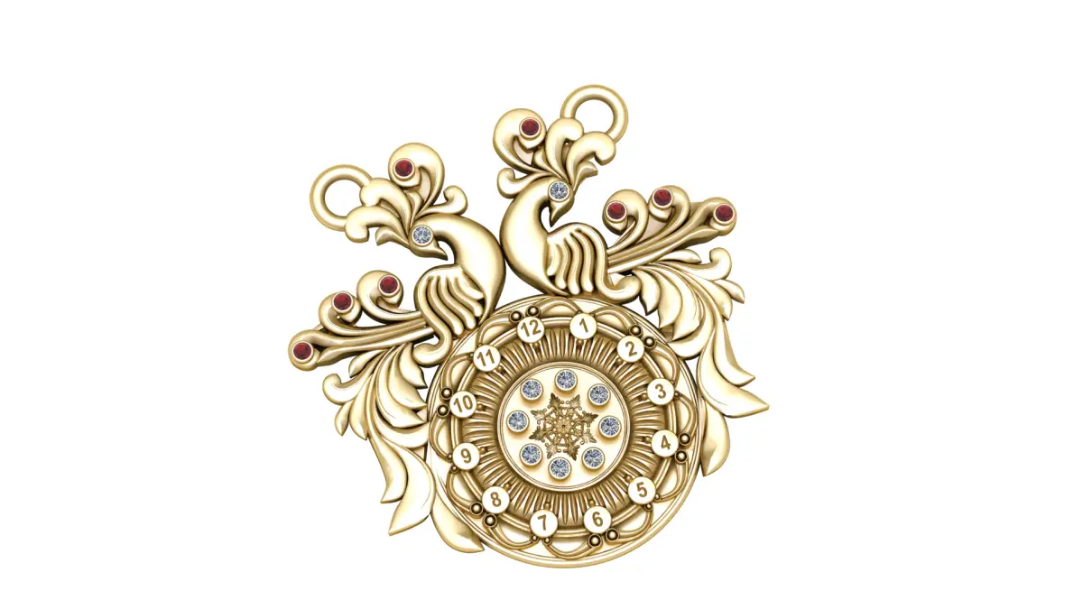 A luxurious and highly artistic pendant available in both yellow gold and white gold finishes. The design features an intricate double peacock motif with gracefully flowing feathers, surrounding a central circular clock-inspired element. The peacock feathers are elegantly accented with round gemstones in red and blue tones, while the central area showcases a brilliant arrangement of bezel-set diamonds. Engraved numerals encircle the inner disc, adding a timeless charm. This piece perfectly blends nature, vintage elegance, and masterful craftsmanship — ideal for collectors and those seeking a statement luxury accessory.