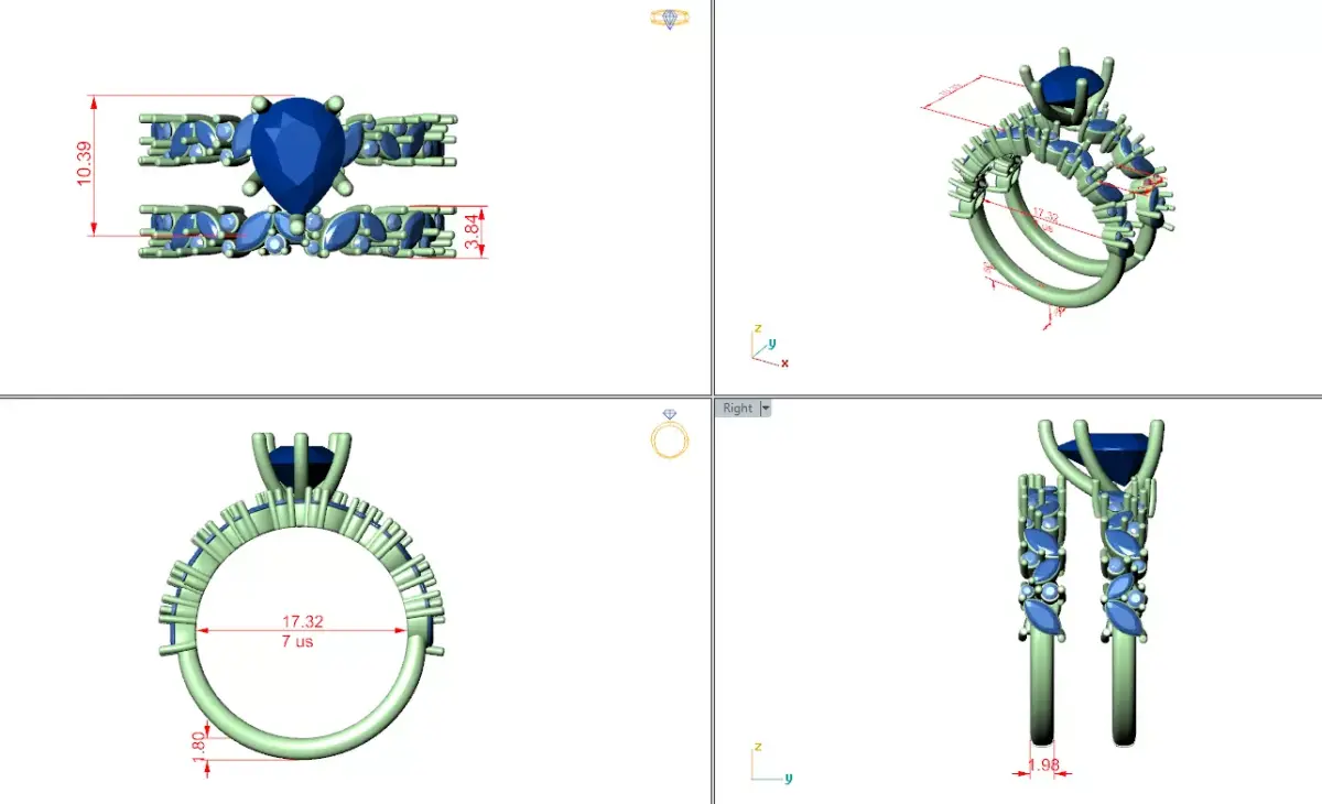 This Pear Cut Floral Halo Bridal Ring Set is a premium jewellery CAD model crafted for elegant engagement and bridal collections. The design features a brilliant pear-shaped center stone secured in a refined prong setting, carefully elevated to maximize light reflection and brilliance. The pear cut creates a graceful, elongated appearance that enhances finger shape and adds a timeless romantic touch.