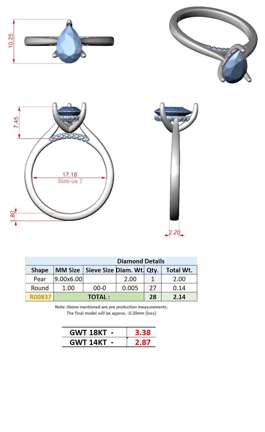 Key Features• Secure pear-cut solitaire stone setting• Protective prong structure for stone tip• Hidden accent stones beneath the head• Manufacturing-friendly construction• Comfortable and durable band profile• Clean surfaces for efficient polishing• Accurate stone seating for production• Suitable for resizing and customization