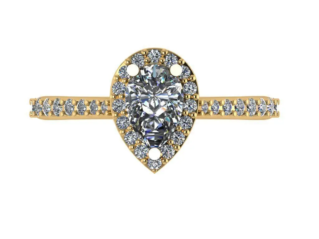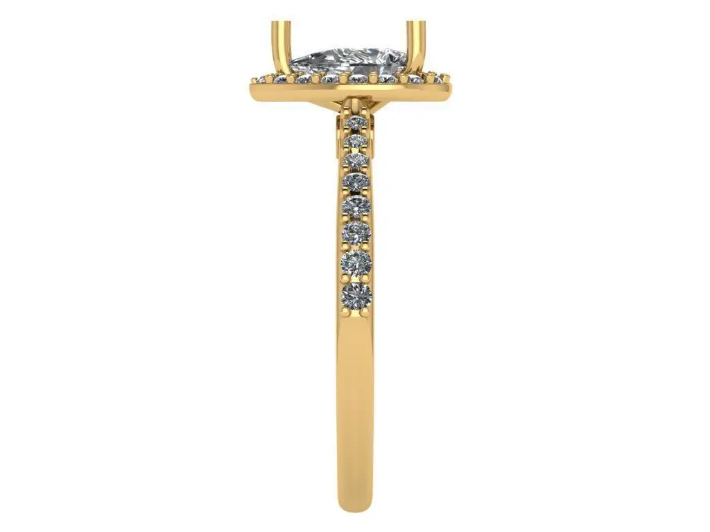 This exquisite ring showcases a glorious pear-shaped center stone embraced by a delicate halo of pavé-set diamonds, creating a mesmerizing display of brilliance. The luxurious design continues along the ring's shoulders, adorned with glittering pavé diamonds that add dazzling dimension and enhance the ring's overall sparkle. The elegant teardrop silhouette of the pear-cut stone elongates the fingers, while the surrounding halo and side pavé details create a captivating, light-refracting effect. Perfect as a show-stopping engagement ring, anniversary treasure, or heirloom piece, this design blends timeless romance with contemporary sophistication.