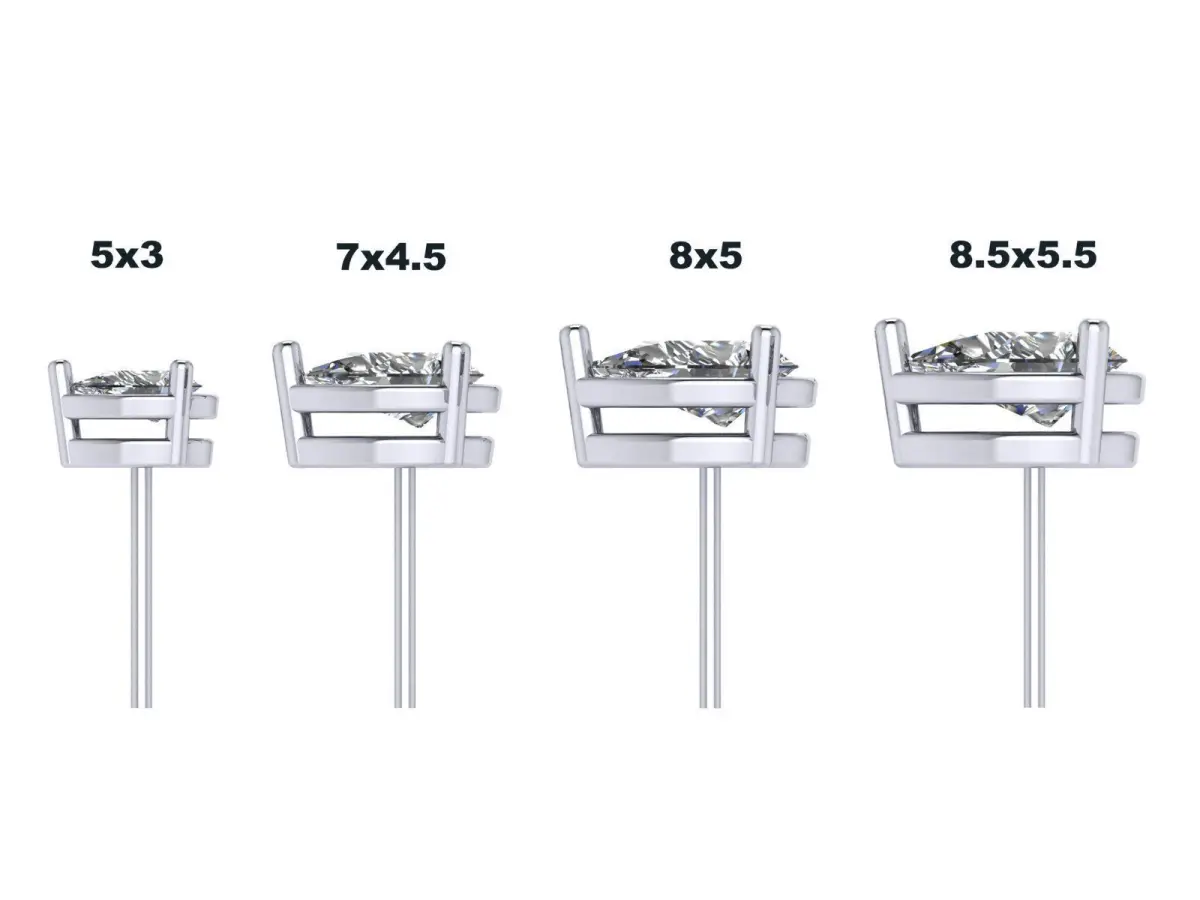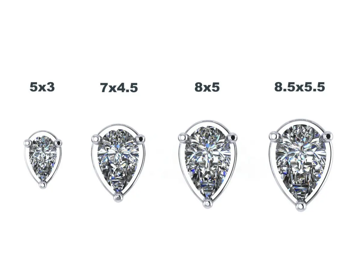 Pear-shaped stone sizes: - 5mm x 3mm - 7mm x 4.5mm - 8mm x 5mm - 8.5mm x 5.5mm
