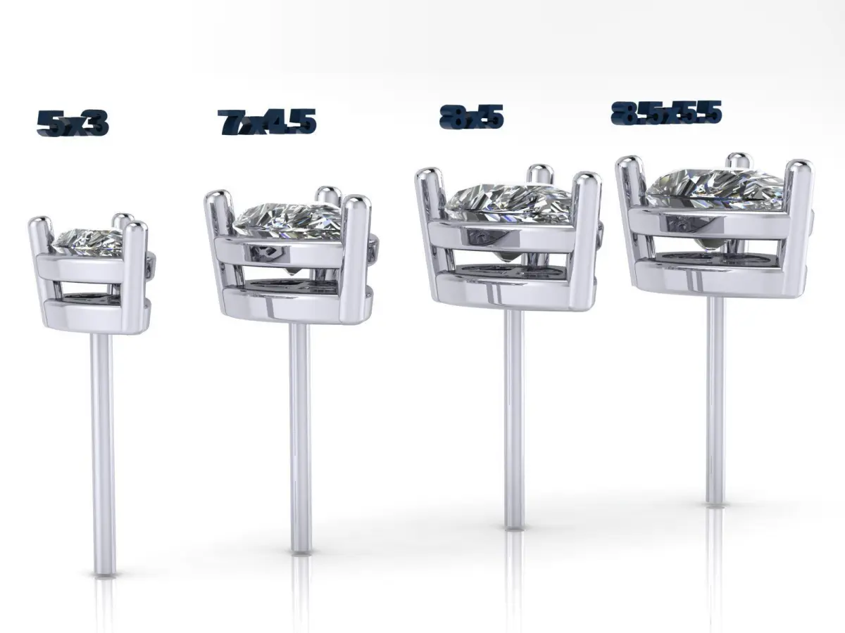 Printable CAD 3D Models of 4 sizes for pear-shaped stone earring heads with 3 prongs.