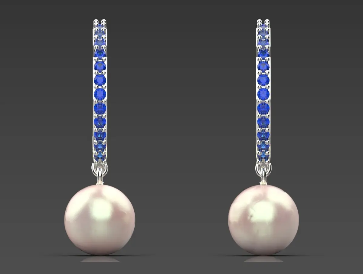 The image features a pair of elegant earrings designed with a modern aesthetic. Each earring consists of a curved silver hoop adorned with blue stones along the top portion. Hanging from each hoop is a large, lustrous pink pearl, adding a touch of sophistication and contrast to the blue accents. The overall design blends contemporary style with classic beauty, making these earrings suitable for various occasions.