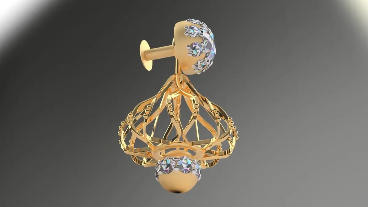 The pear-shaped earring with drops is beautifully designed for a party occasion. The drop is a matt finish that has 7 stones around it. The drop is hanging from the top hook with a short chain.The semi-sphere stud is also the matt finish with a large stone at the center and 8 small stones around it.The stud is a screw-type design to hold the weight of the body and the drops (together 8 gm +)