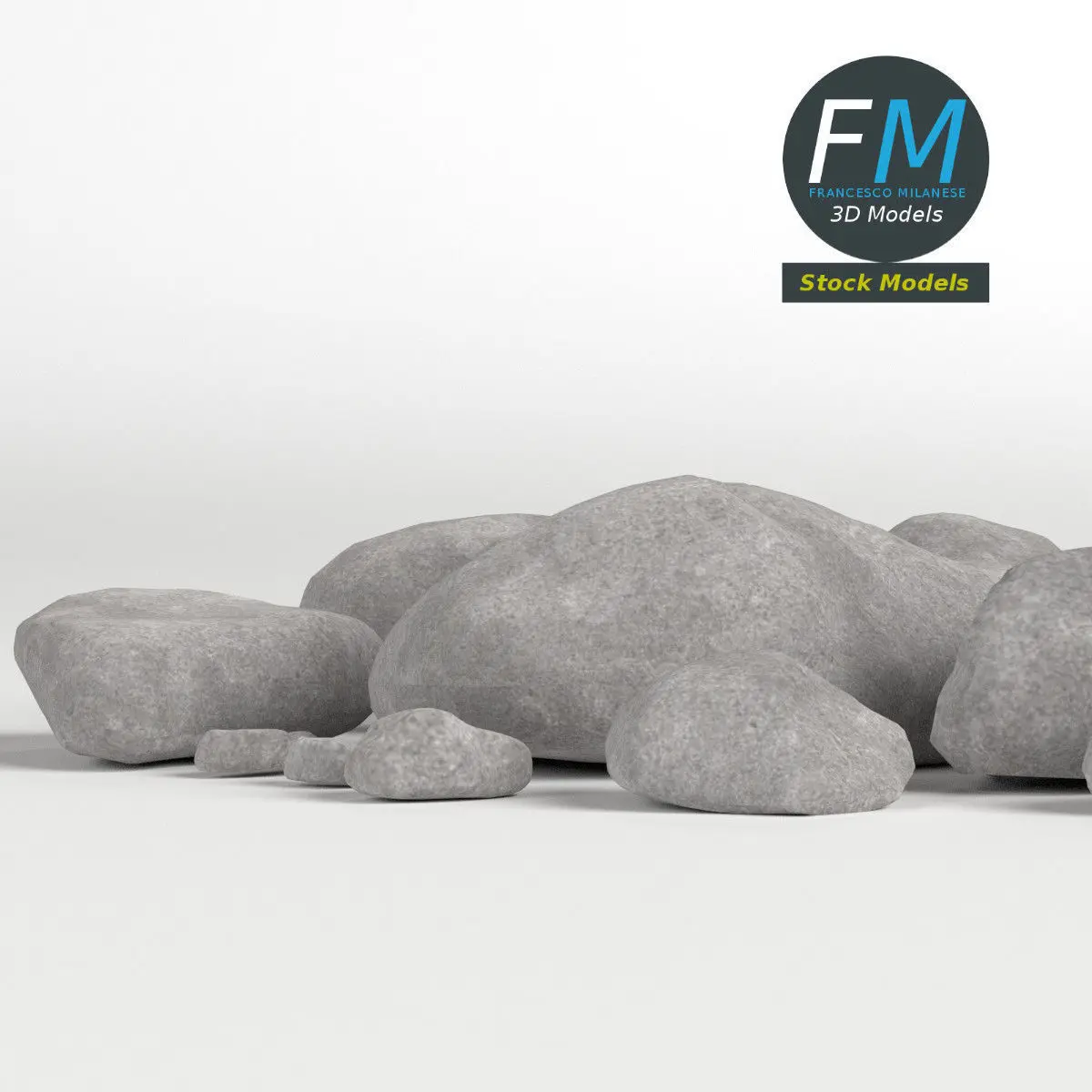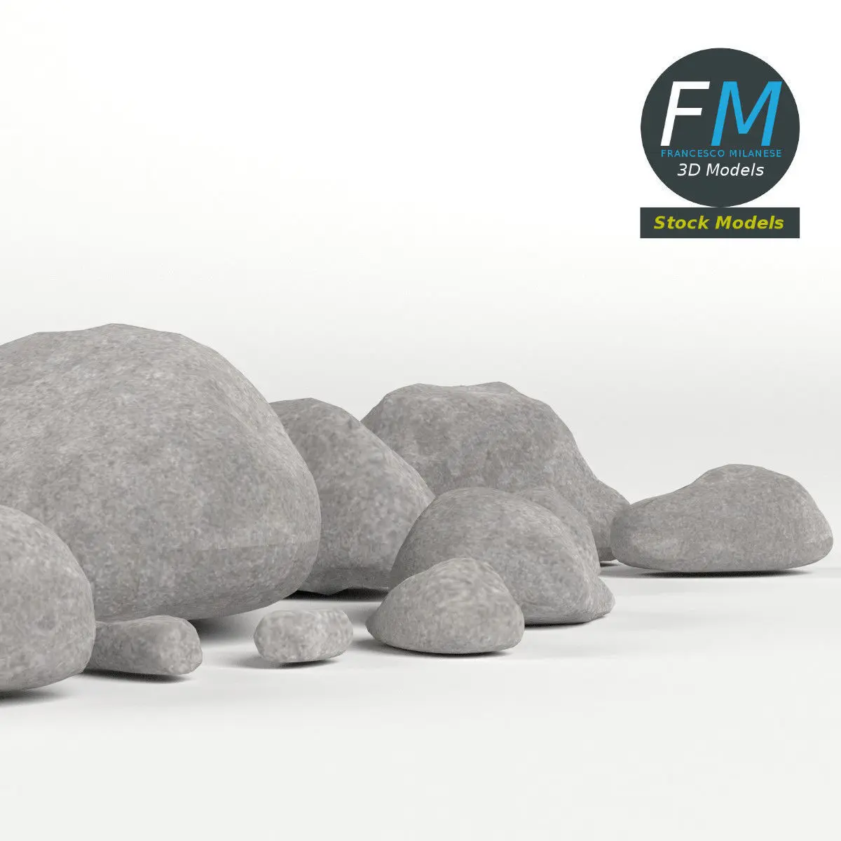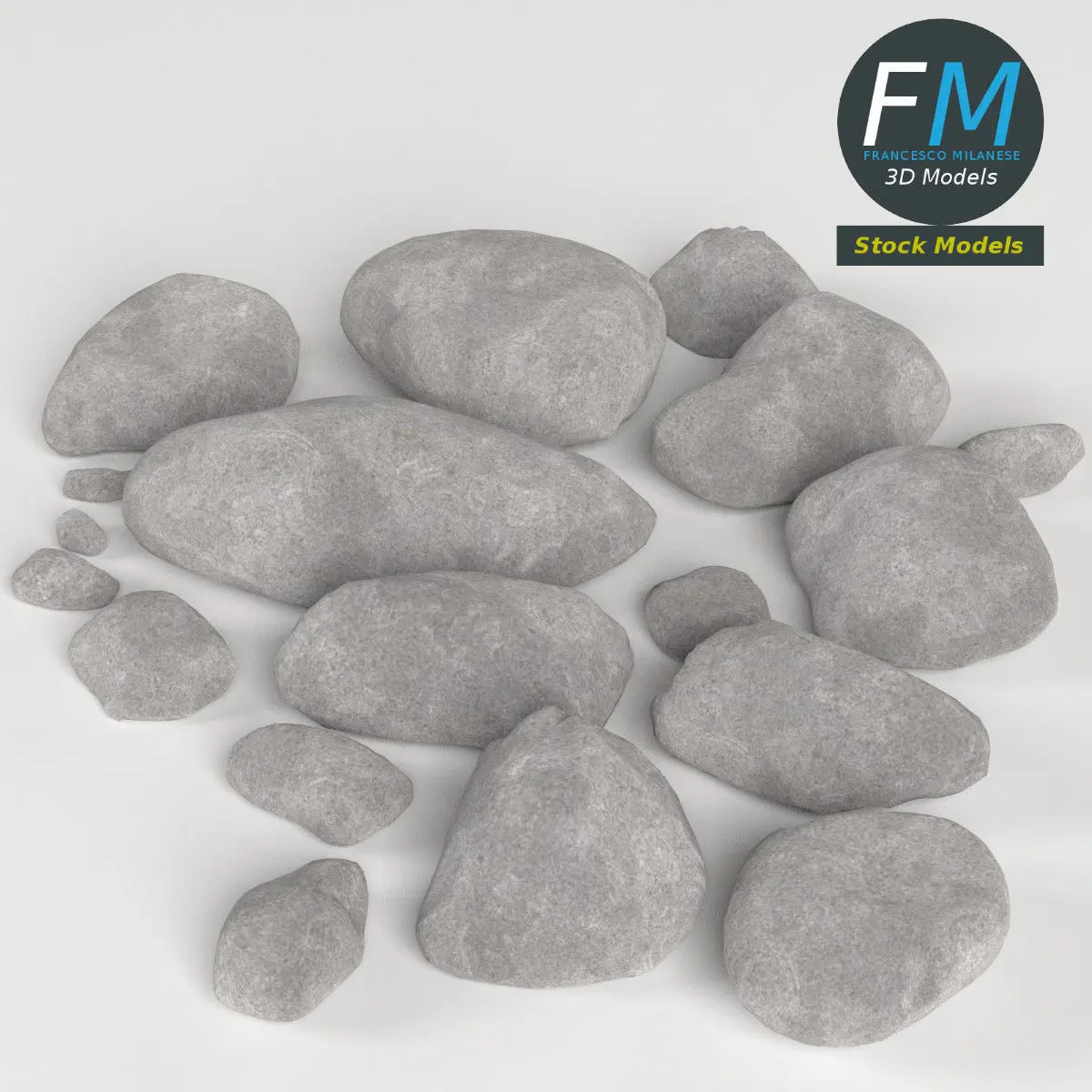 A set of 18 rocks (9 pebbles, 9 stones) 3D Models; 18 individual objects sharing the same non overlapping UV Layout map, Material and PBR Textures set. Production-ready 3D Model, with PBR materials, textures, and non overlapping UV Layout map provided in the package.