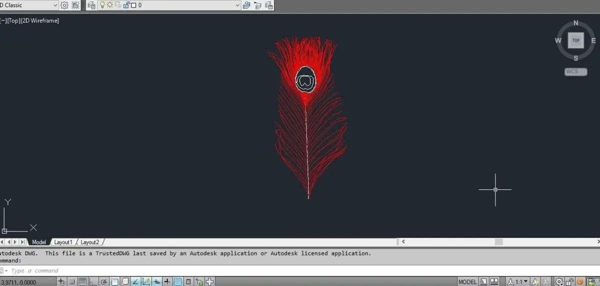 Pecock feather beautiful iridescent colors in the light. These pecock tails and eyes are always in season known to go great with all decorations. As centerpieces at the fanciest tables, hat trims, or made into pins of jewelry etc. Good luck, harmony, serenity, peace of mind, relaxation and protcetion are all associated with the magnificent pecock feathers. This pecock feather is the favourite things of lord shri Krishna. Single line and polyline commands have been used at some places in AutoCAD' file.