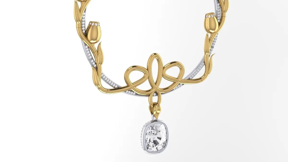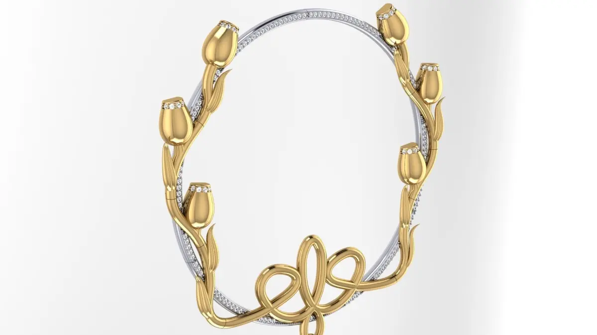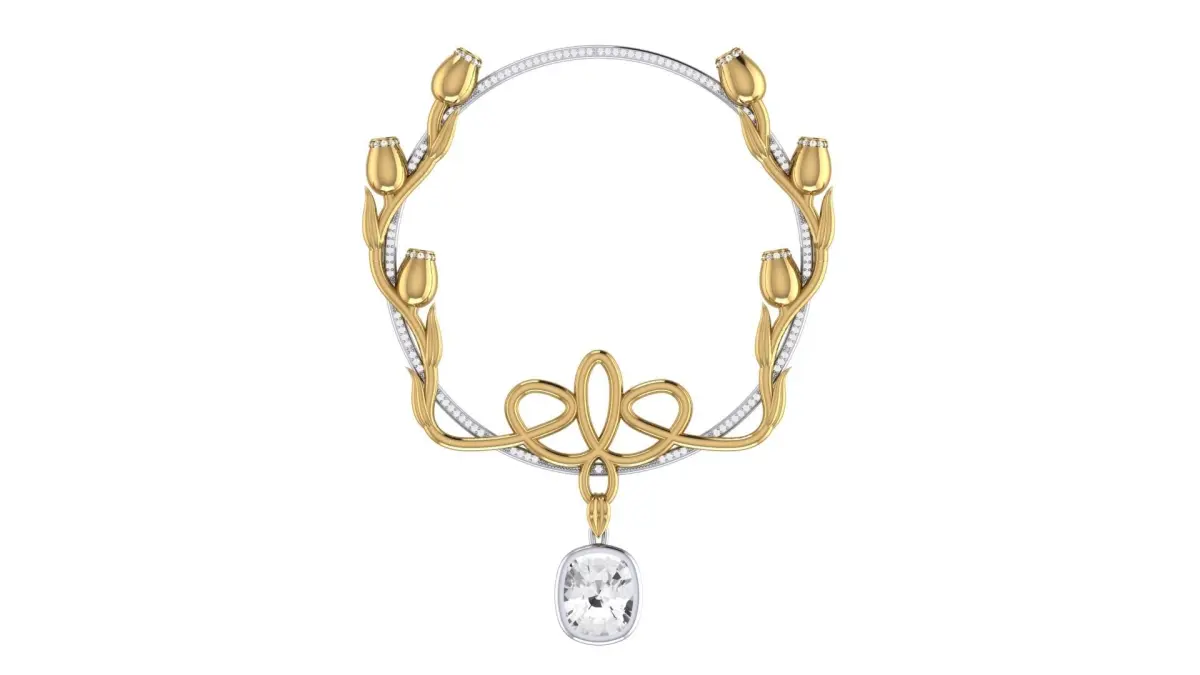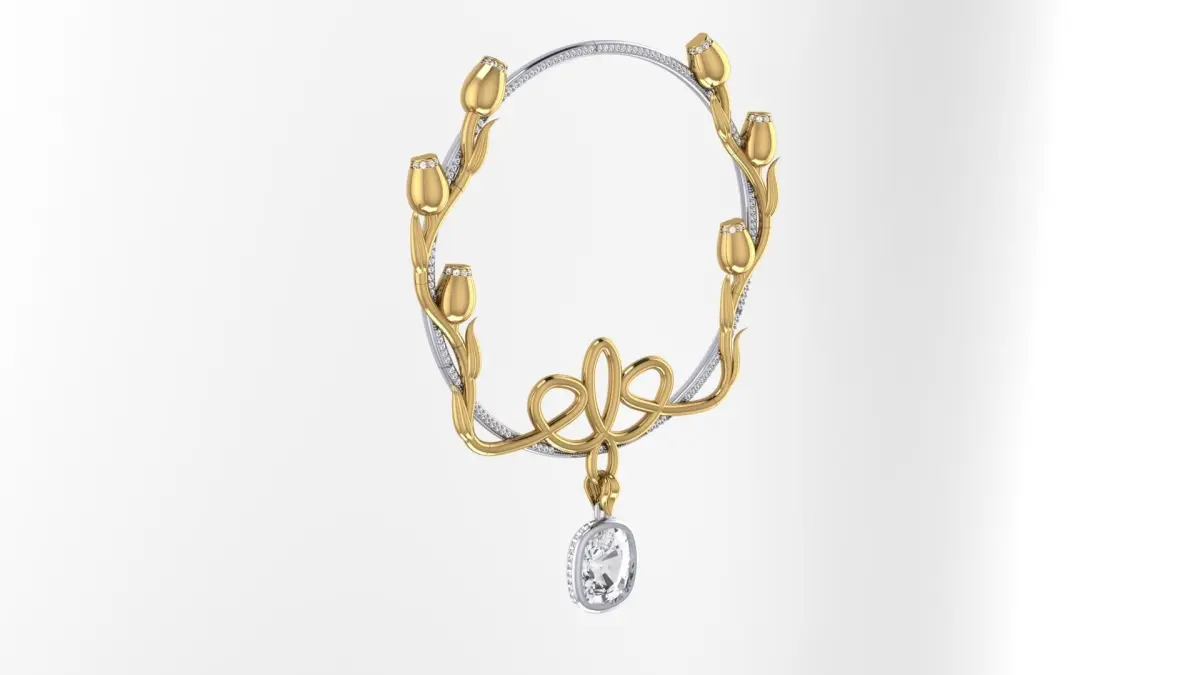 The 20s, the hit of the season that never goes out of style.A unique pendant in the Art Deco style, consists of three levels and 15 parts. The base of the pendant is a hoop with a diameter of 62 mm. The hoop consists of 3 parts, which are soldered to each other and there are recesses on it for setting decor. 96 stones with a diameter of 1 mm can be installed on the hoop. ...The second level is a floral decor consisting of 9 parts and a decorative pendant assembly with a large stone.30 stones with a diameter of 1 mm are installed on the tulip decor.And the third level is a large stone in the shape of a Cushion and measuring 12mm x 10mm in a blind frame. 35 stones with a diameter of 1mm can be installed on the frame.