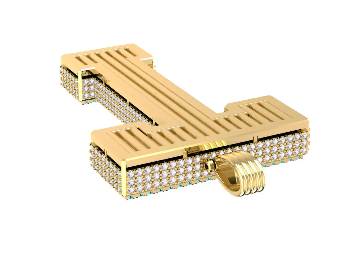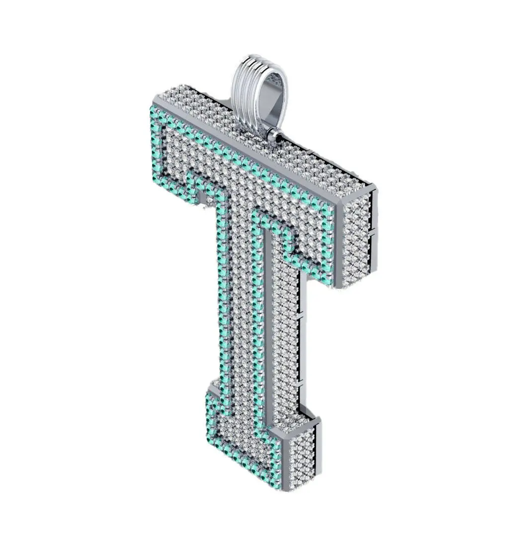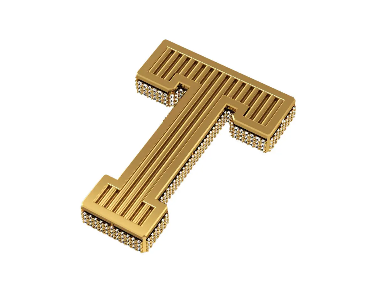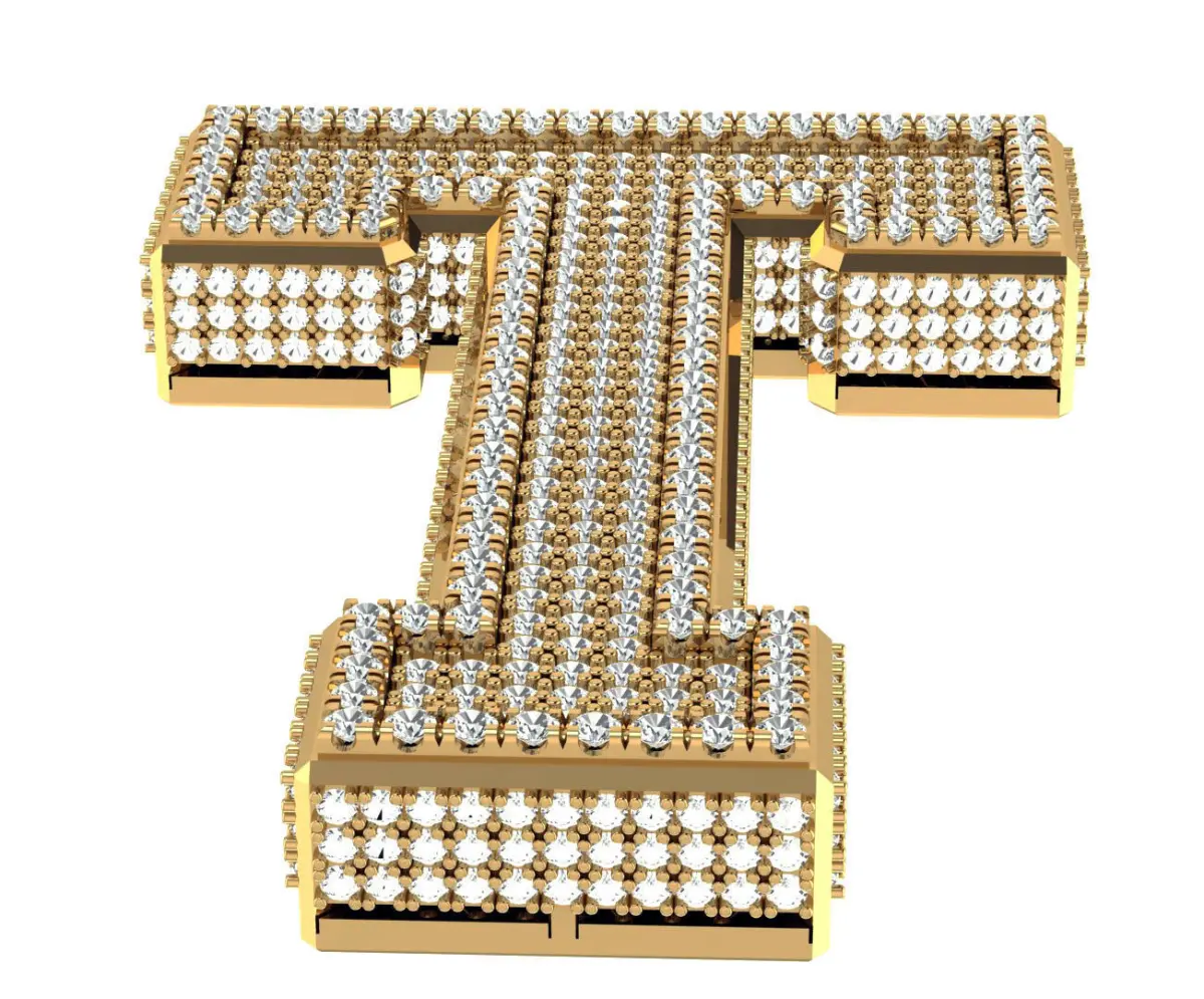 3Just for real men !!! A special series of pendants in the form of Latin letters and numbers, made in the American style. Pendant-letter T , consists of three parts: the front, back and the loop for the chain. You can install 658 round cut diamonds with a diameter from 1.2mm to 16mm on the front . The total size of the pendant is 57mm x 34mm x 7.2mm. The total weight is , 33.14 grams 14 carats of yellow gold. The original design allows you to improvise with a choice of metal and its color, as well as with a choice of precious and semiprecious stones and their color. The model is presented in the STL and OBJ formats and is ready for printing.