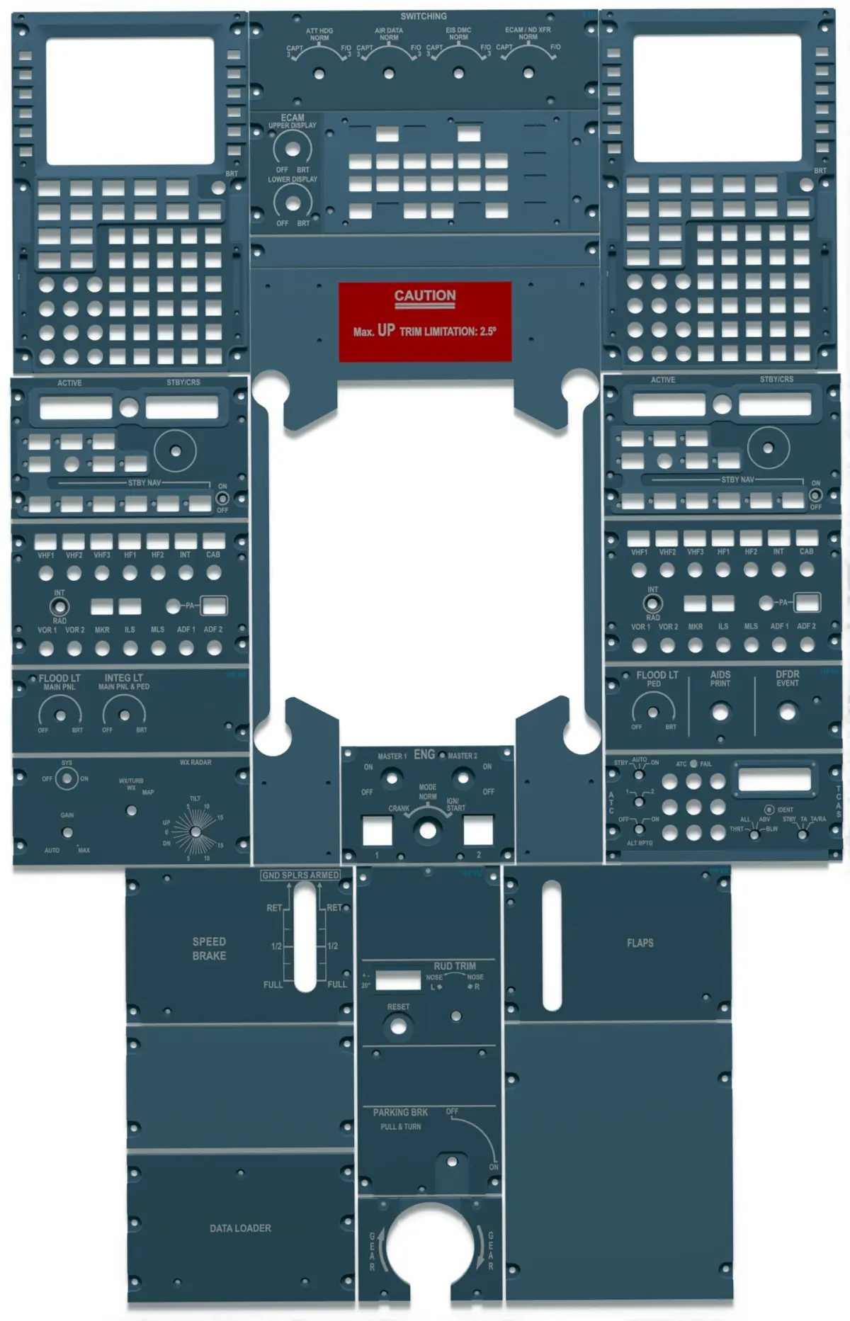 These are all the pedestal panels of the Airbus A320 family. Ready for 3D printing or laser cutting, and use in your simulator booth or other needs.