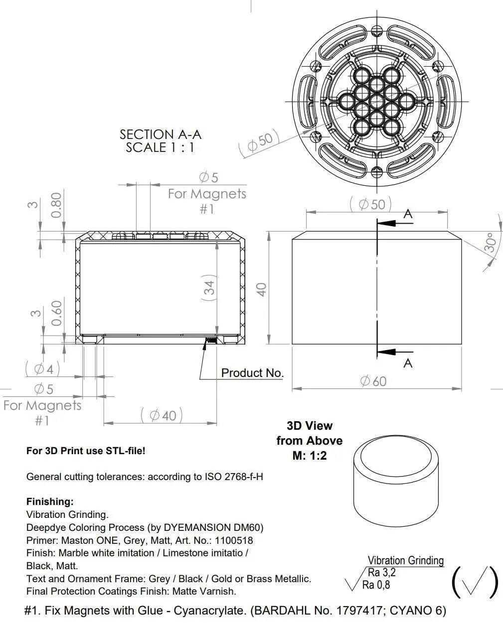 The lower circle has the same possibility for installing magnets to attach/fix the base to the shelf (NB! steel shelf, Elfa, GWS, etc.).If it is necessary to fix it precisely, it is recommended to use a pin/pins, to drill holes in the appropriate place, both on the base and on the figure.The position/orientation of the figure can also be determined with the selection of magnetic slots (if this is important (for example: when adding an information board or label to the side surface of the pedestal. The figure is oriented and looks in the same direction as the label.).NB! the pin can be fixed either in the figure (or on the base), this allows the figure to be removed from the base. The pin fixes the position and the magnet holds the figure in place.These are still pedestals for static figures!The figure can be placed on a rotating base together with the base.A wire from (0.3 mm) is suitable for the pin; 0.5 mm, 1 mm, which is on hand and in use, and a spiral figure from the selection of the drill.