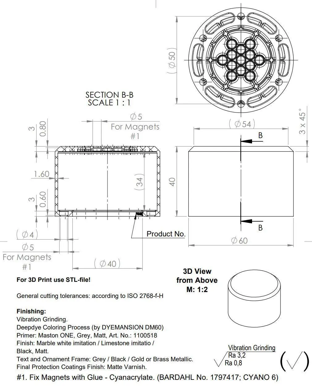 NB! polarity in the case of magnets (Pulling - pushing)! Figure and pedestal; Pedestal and stand.A more reliable way is to use a magnet and a steel answer. Either press a steel disc or a magnet into the socket, which can be glued (with CA glue).The lower circle has the same possibility for installing magnets to attach/fix the base to the shelf (NB! steel shelf, Elfa, GWS, etc.).If it is necessary to fix it precisely, it is recommended to use a pin/pins, to drill holes in the appropriate place, both on the base and on the figure.The position/orientation of the figure can also be determined with the selection of magnetic slots (if this is important (for example: when adding an information board or label to the side surface of the pedestal. The figure is oriented and looks in the same direction as the label).