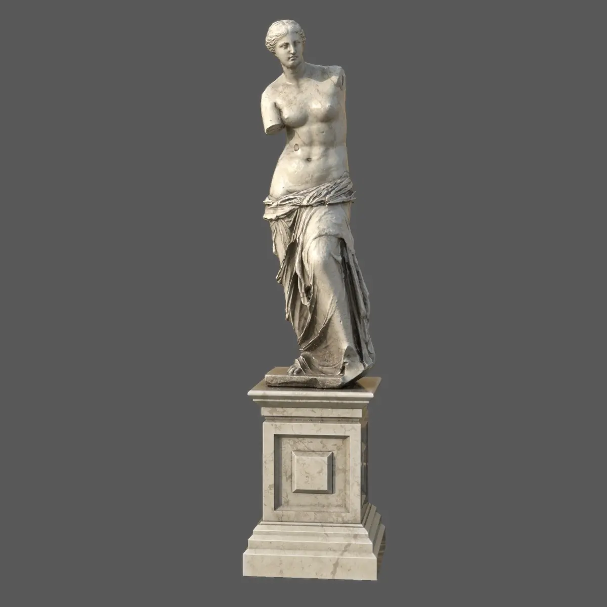 This is a low poly 3D model of the iconic Venus de Milo statue on a marble pedestal, perfect for real-time applications such as games, AR/VR experiences, and interactive visualizations. Modeled with optimization in mind while maintaining a high level of detail and realism.