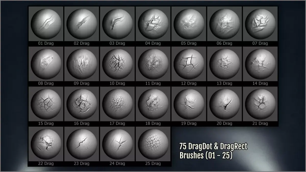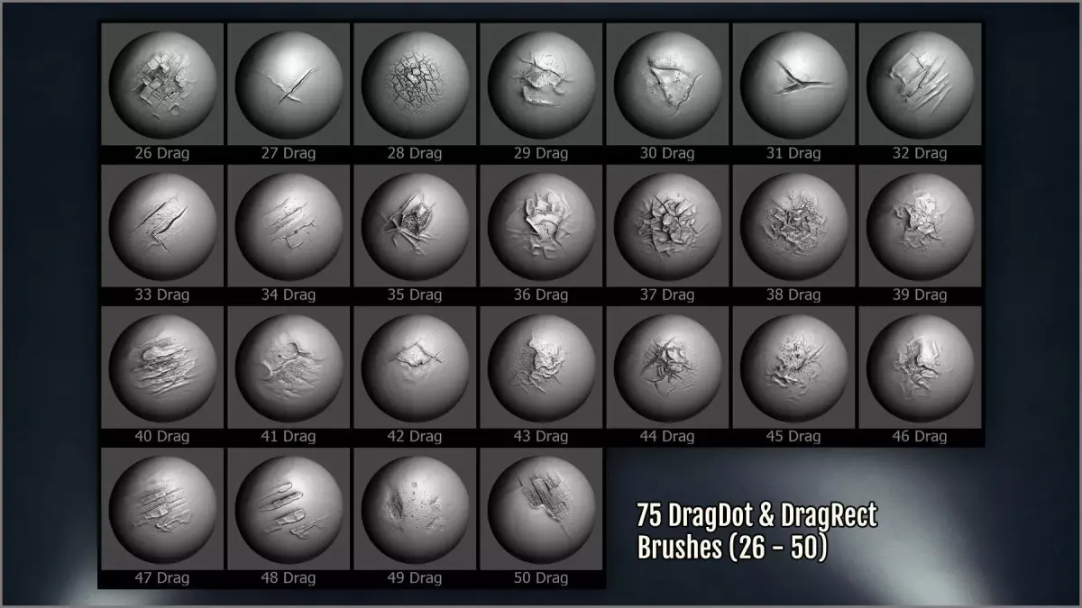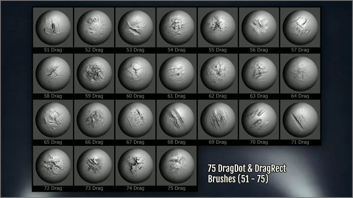 - 300 ZBrush brushes of different kinds: dragrect, dragdot, draw brushes, and spray.