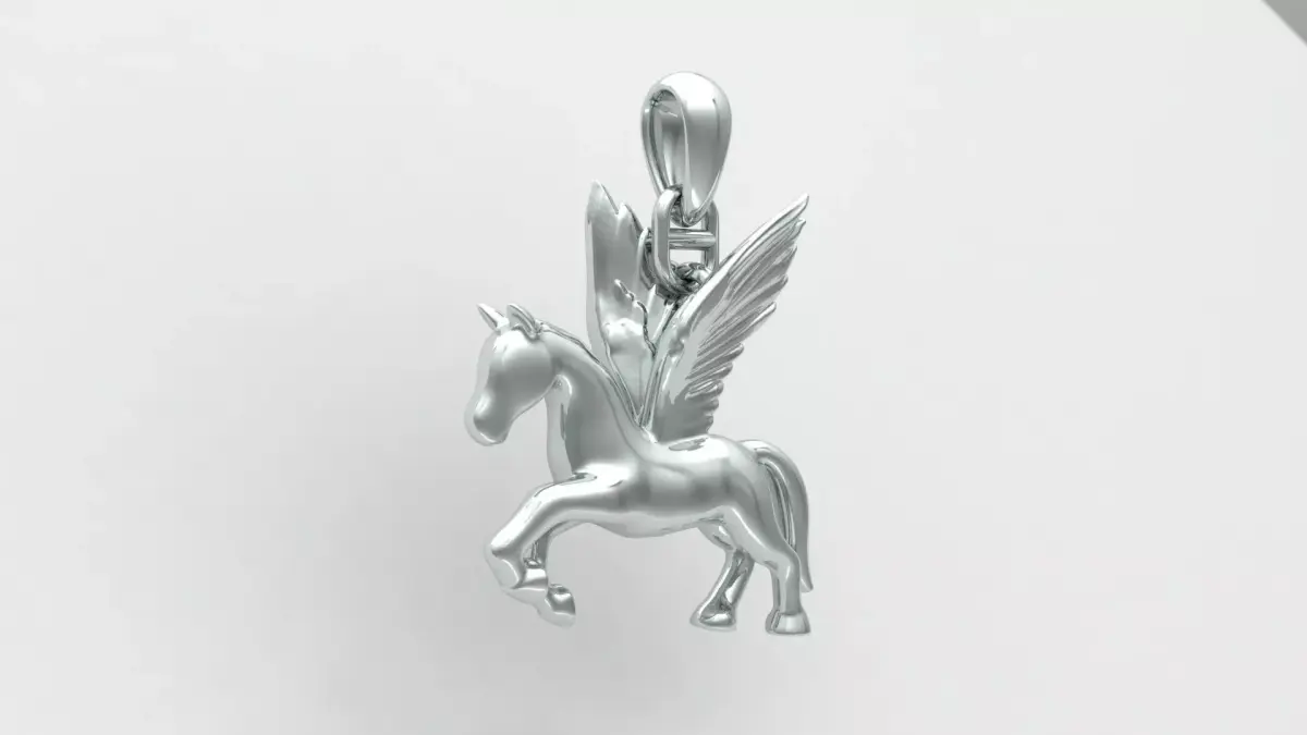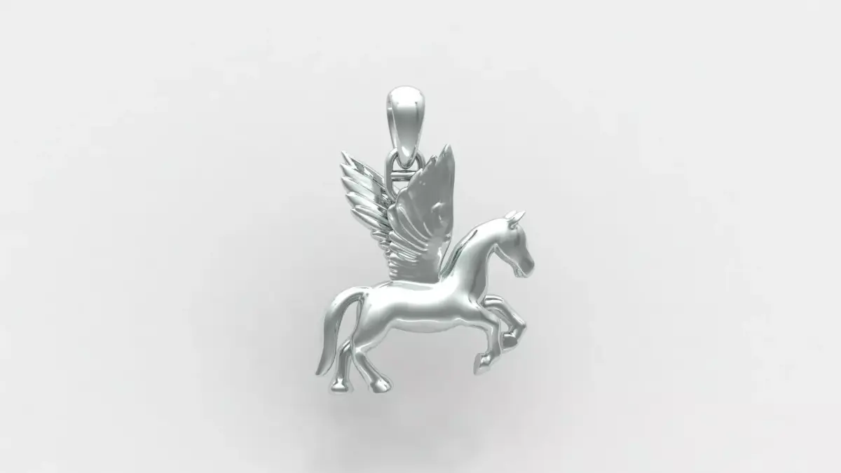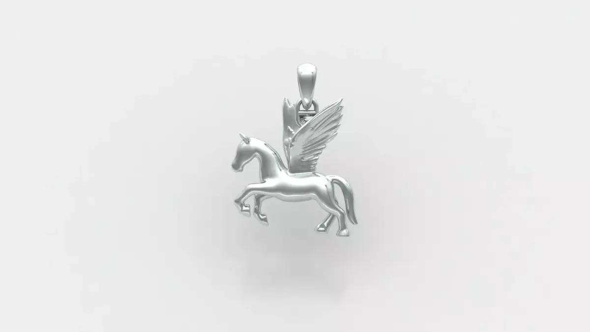Elegant and dynamic Pegasus horse pendant designed for high-quality jewelry production. The model features a stylized flying horse with detailed wings and smooth organic surfaces, creating a balanced combination of mythology and modern minimal design. Ideal for gold, silver, or precious metal casting.