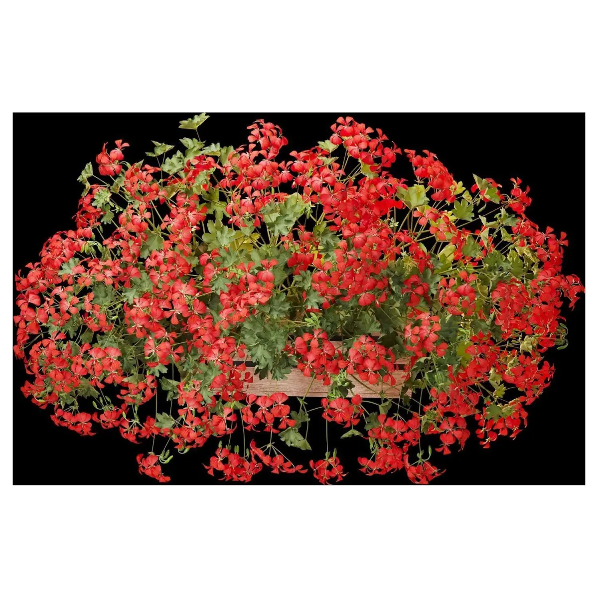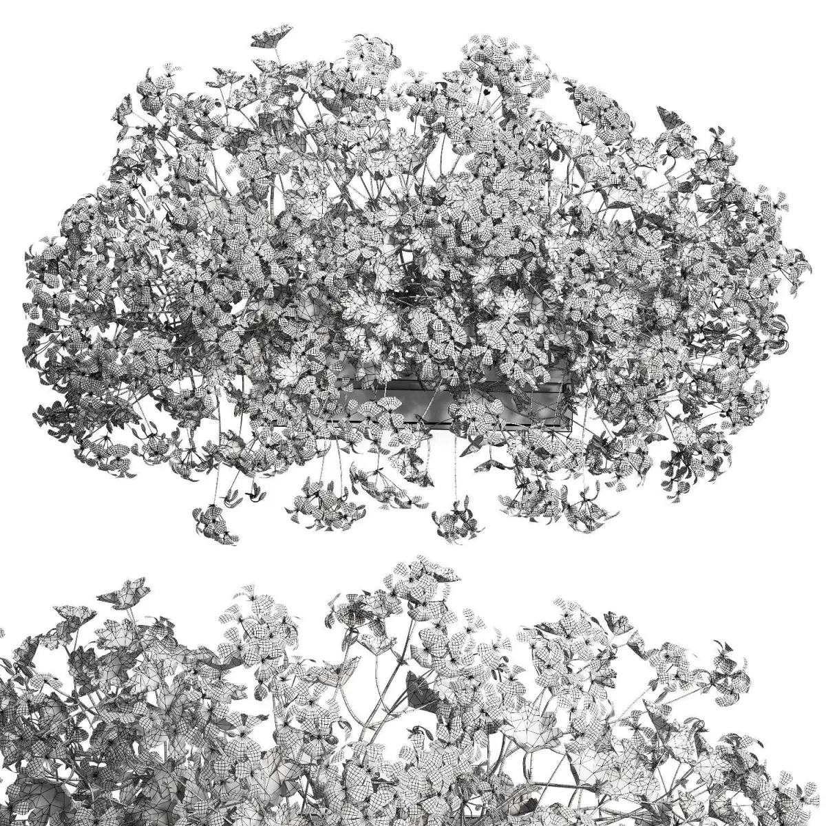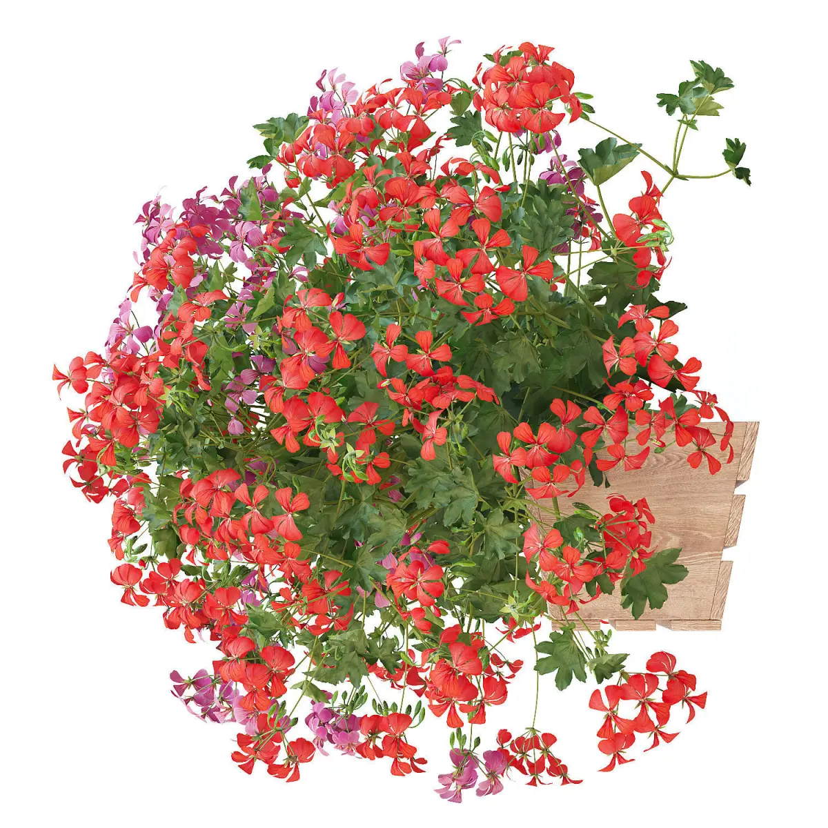 Pelargonium peltatum ampelous - outdoor plant for decorating terraces, balconies, window sills, facades, windows. The model consists of a wooden planter and 3 plant bushes that you can combine or use with your own planter or hanging vase.There are 2 colors of flowers in the model, but you can easily make them the same color by applying the same material to all.The model does not use the Opacity map, all parts are made by geometry.