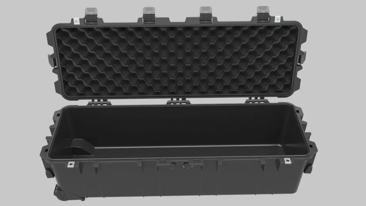 Pelican long caseCarry your rifle and accessories safely in this Pelican 1750 53" Long Case. The case is water-tight, crush- and dust-proof to protect your rifle during your travels, and the stainless-steel hardware and padlock protectors provide corrosion resistance. An o-ring seal offers moisture resistance, while the automatic pressurization valve provides safety. The case can withstand temperatures of -40° to 210°F and features a maximum buoyancy of 187.39 lbs. The fold-down handles and the strong polyurethane wheels provide travelling comfort, and the 3-piece foam construction offers secure protection.