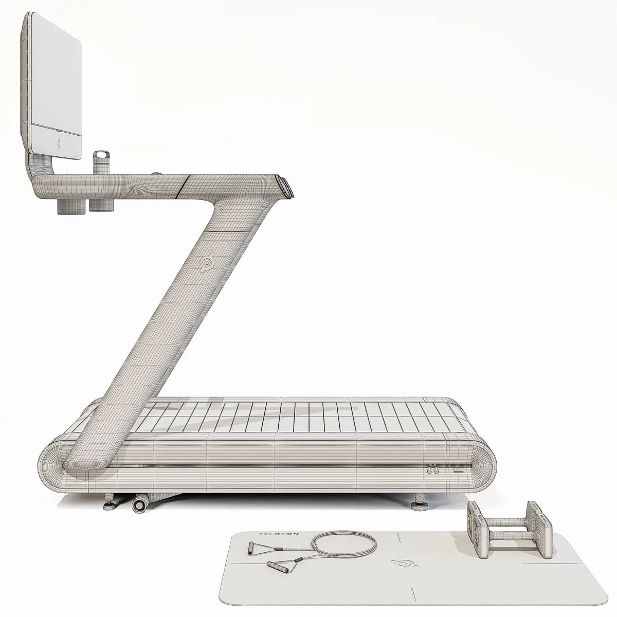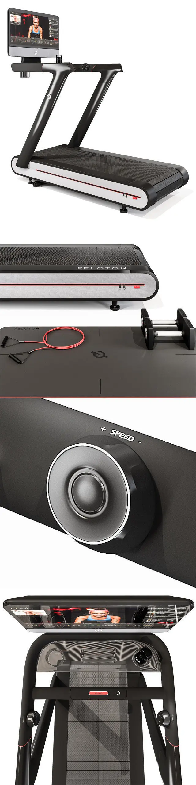 Tread by Peloton. Model consists of tread itself, exercise mat, jumping rope, weights and water bottle. Model is prepared for Vray with converted Corona model attached as well. Poly count tread: 366.942 Poly count with other assets: 425.099