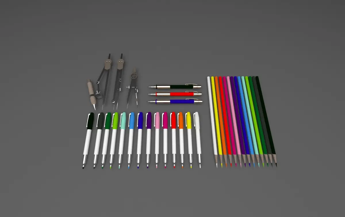14 colored pencils, 14 felt-tip markers, 3 mechanical pencils, and 3 different compass sets. max.3ds.stlfbx.obj.dae.You can contact for other formats.