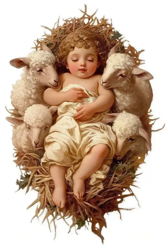 This image is a serene and heartwarming artistic depiction of the Nativity, focusing on the peaceful slumber of the infant Jesus. It combines classical religious themes with a soft, illustrative style that evokes a sense of divine calm and protection. A central figure of a sleeping baby (Infant Jesus) resting on a bed of golden straw, surrounded by four gentle, white lambs. High-detail digital illustration with a soft, vintage aesthetic reminiscent of classical oil paintings or fine porcelain art.