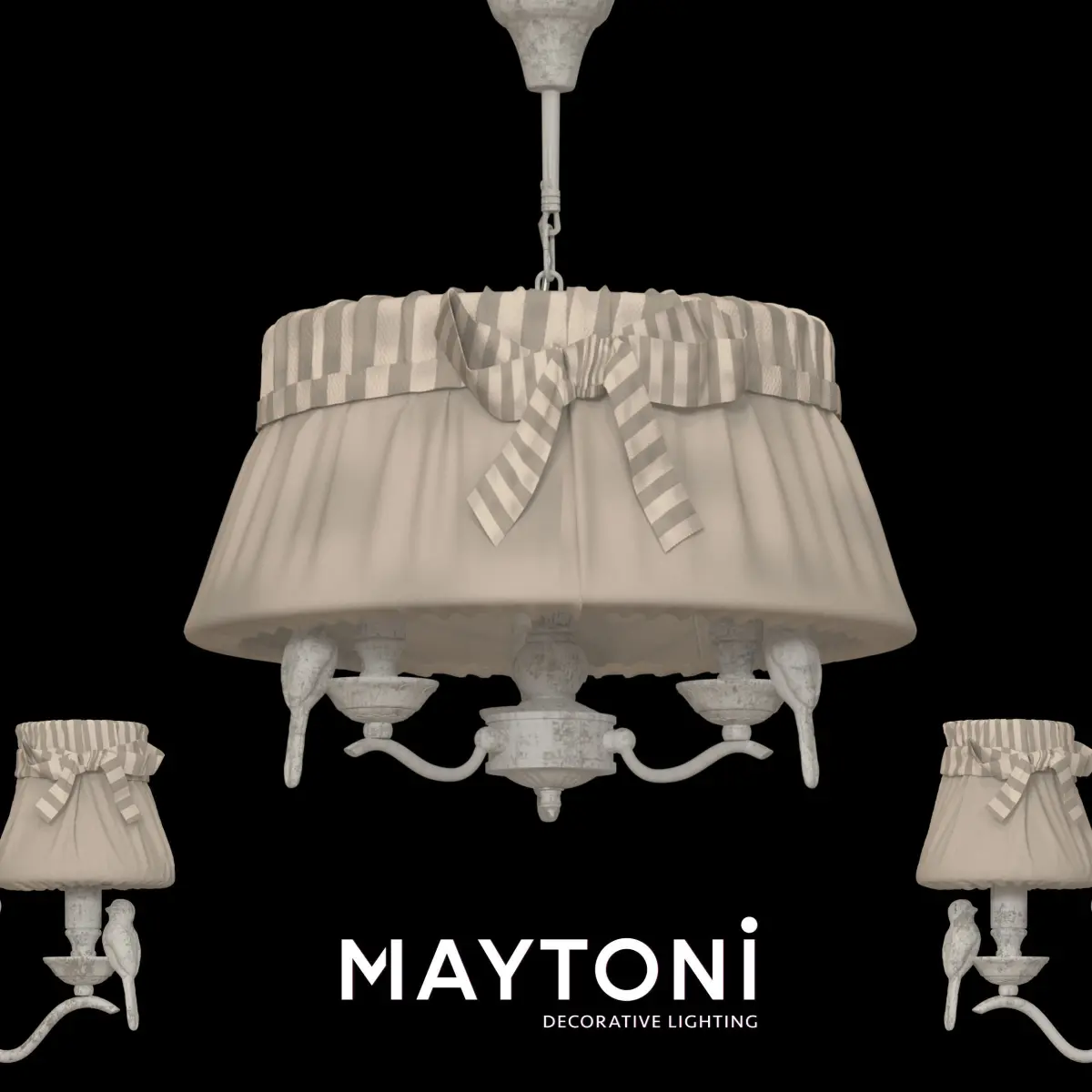 Metal frame. Decorative elements in the form of polyresin birds. Lampshade of linen on an elastic band (removable).