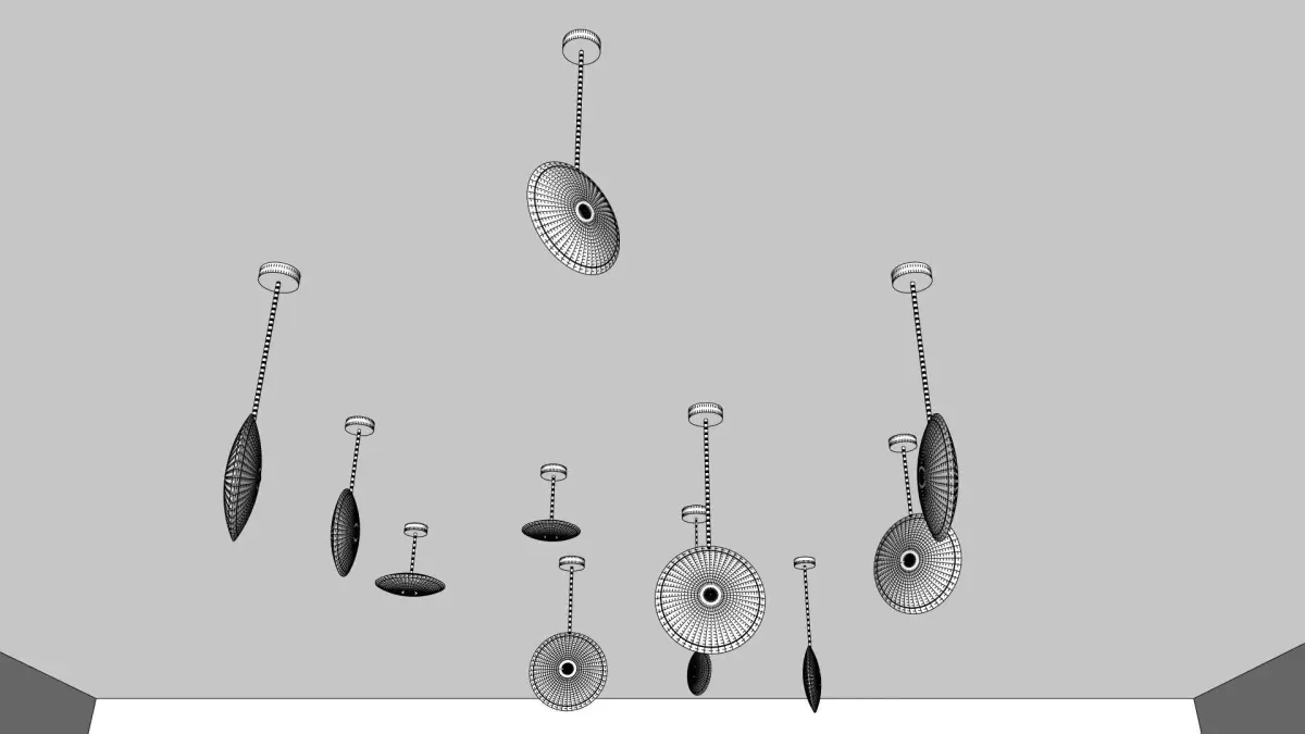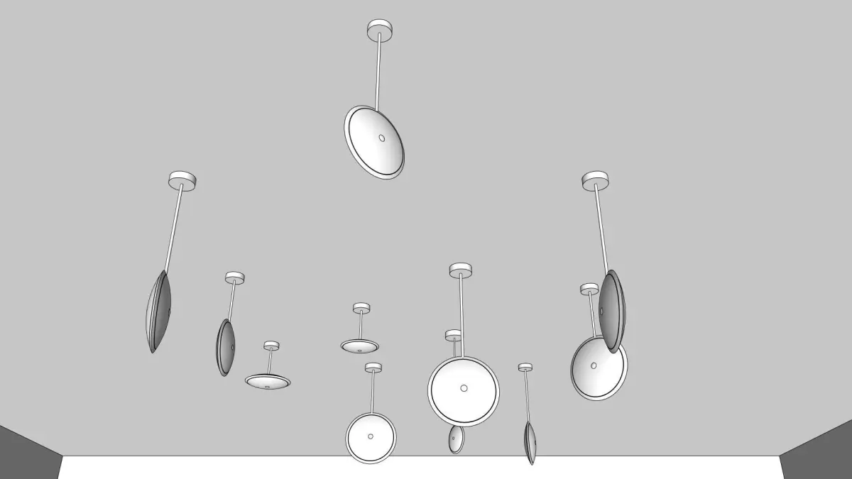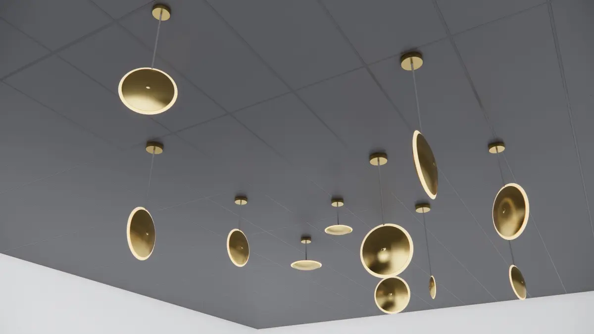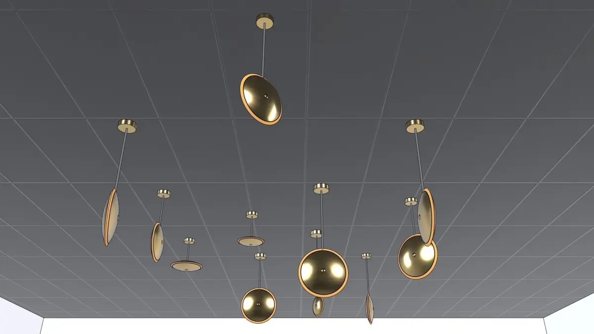 This is a 3D model for modern pendant ceiling lamps. made out of brushed brass shaped like convex disks and emits warm light from the edges. Modeled natively in Sketchup and rendered using Enscape and Blender Cycles. Available in multiple formats and compatible with most 3D software. suitable for modern interior spaces.