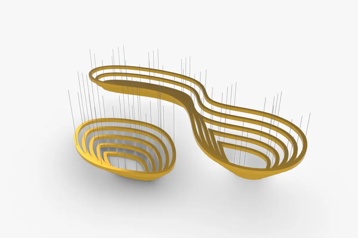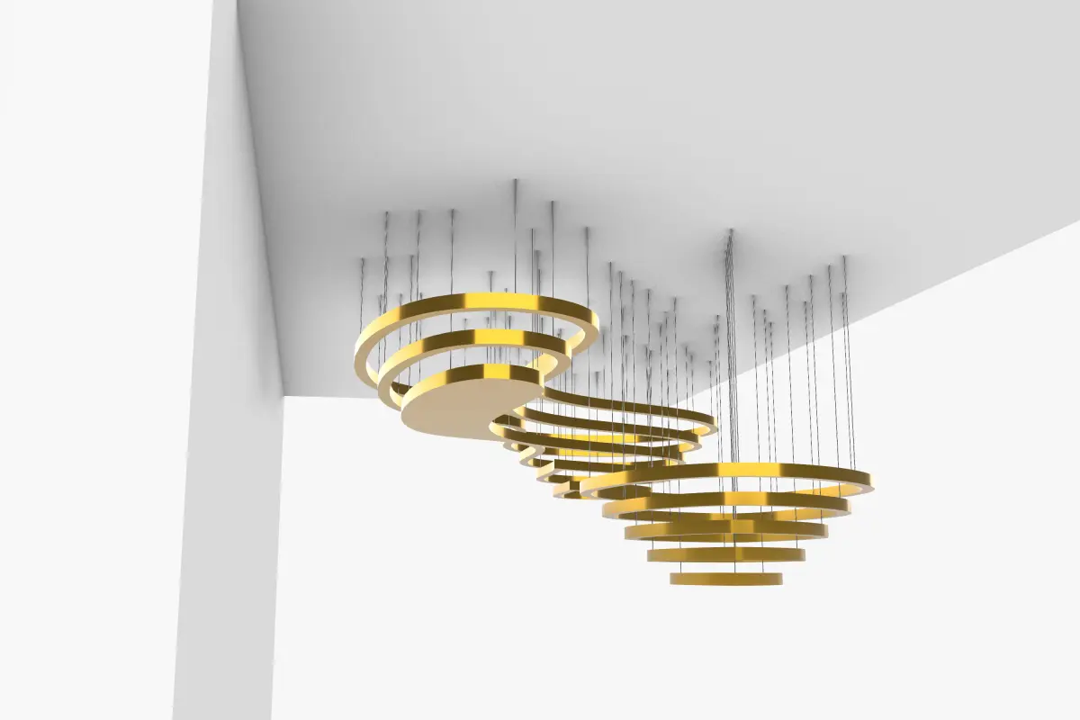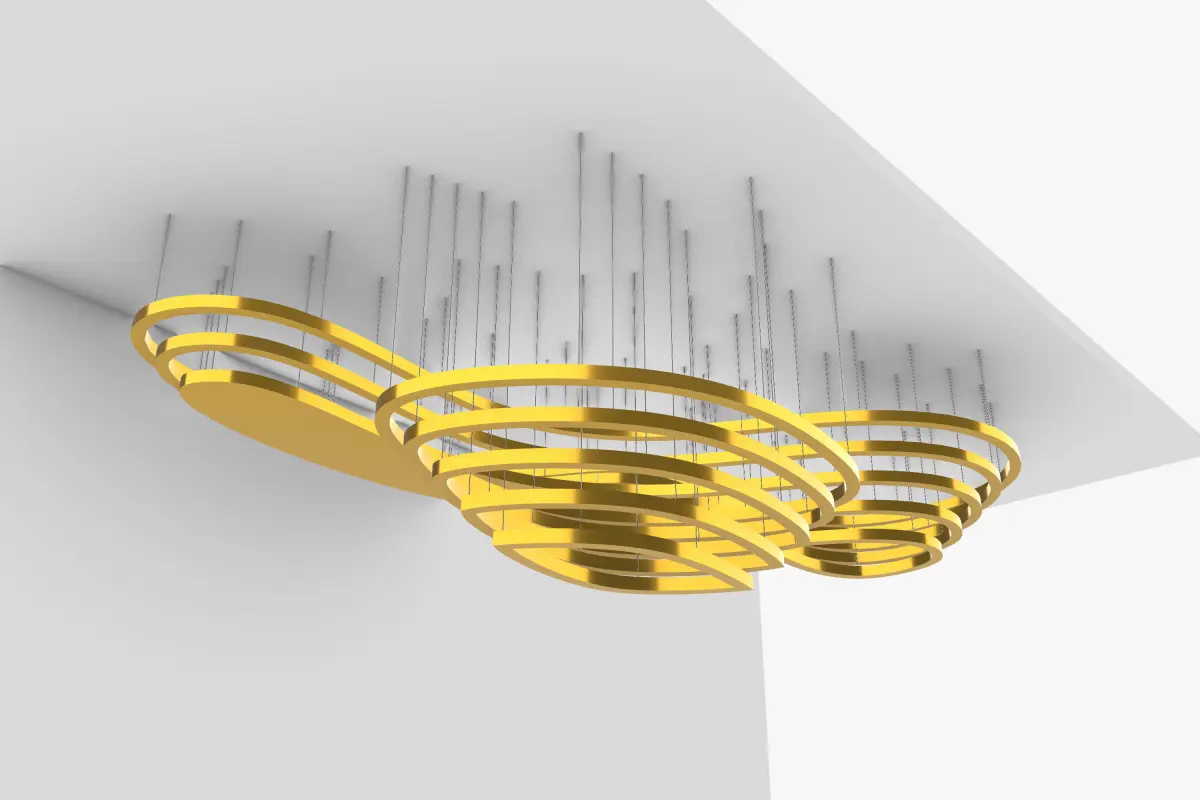 Pendant Elegant Ceiling Decoration, a golden collection of smooth wavy tracks inside each other, the decorative object has an elegant minimalist taste to the architectural Interior, The Metal Objects are hanged from the ceiling with variable heights for each single object.