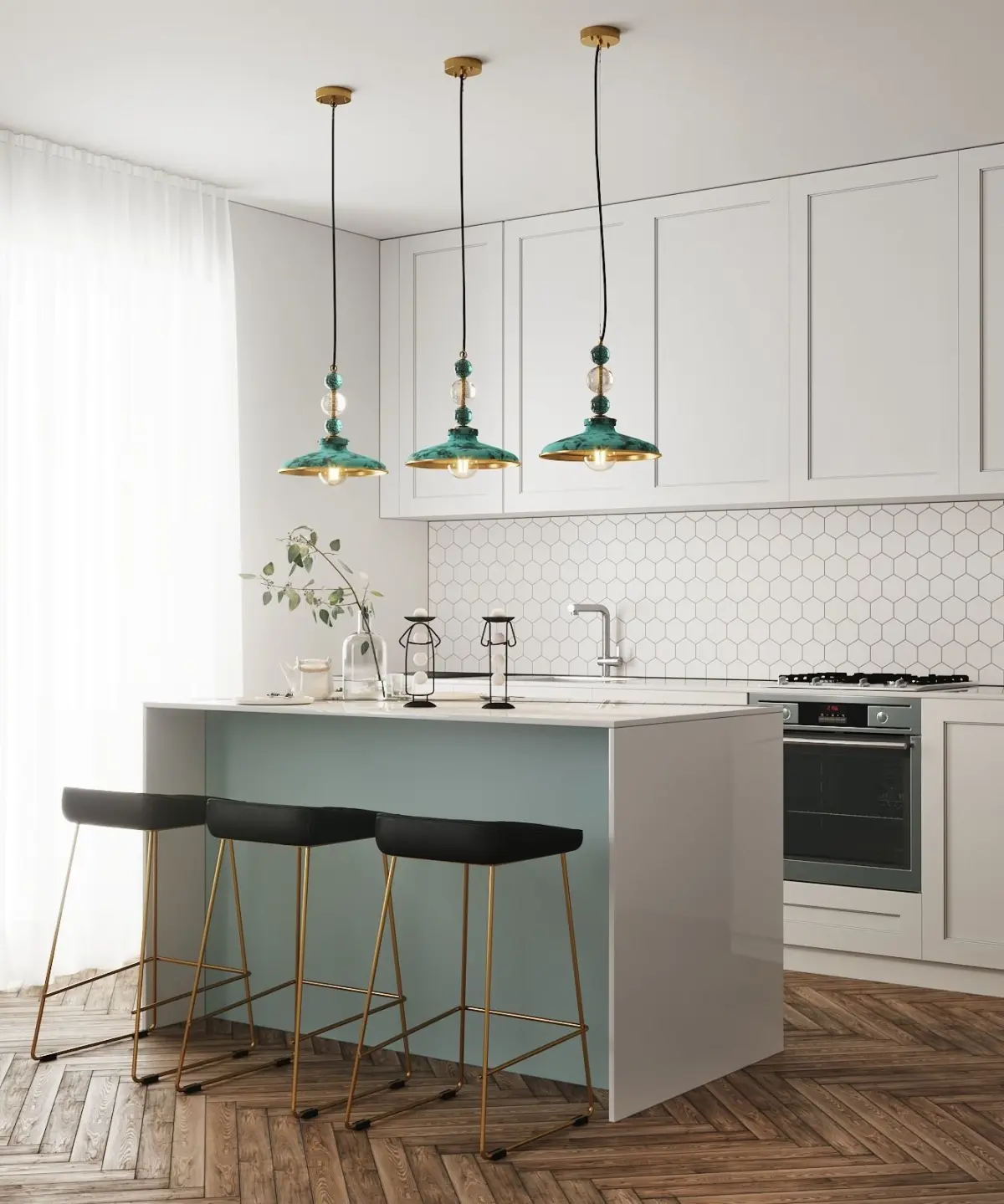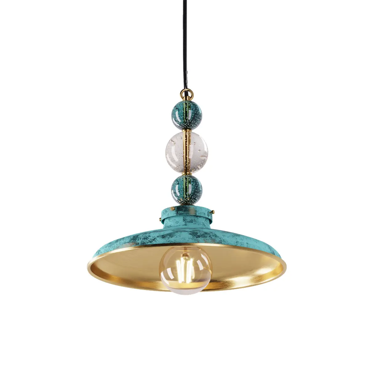 Pendant light KVKZ Green brass SKU.5423 by PikartlightsBrass covered with a green patina combined with glass balls and polished brass details create a perfect composition of harmony of textures and materials. A colorful chandelier adds the freshness of spring, becomes a great accent in monochrome interiors, and dilutes gray everyday life, giving a mood of lightness and a touch of carefreeness. Made of brass and glass. For more information please check the product page: