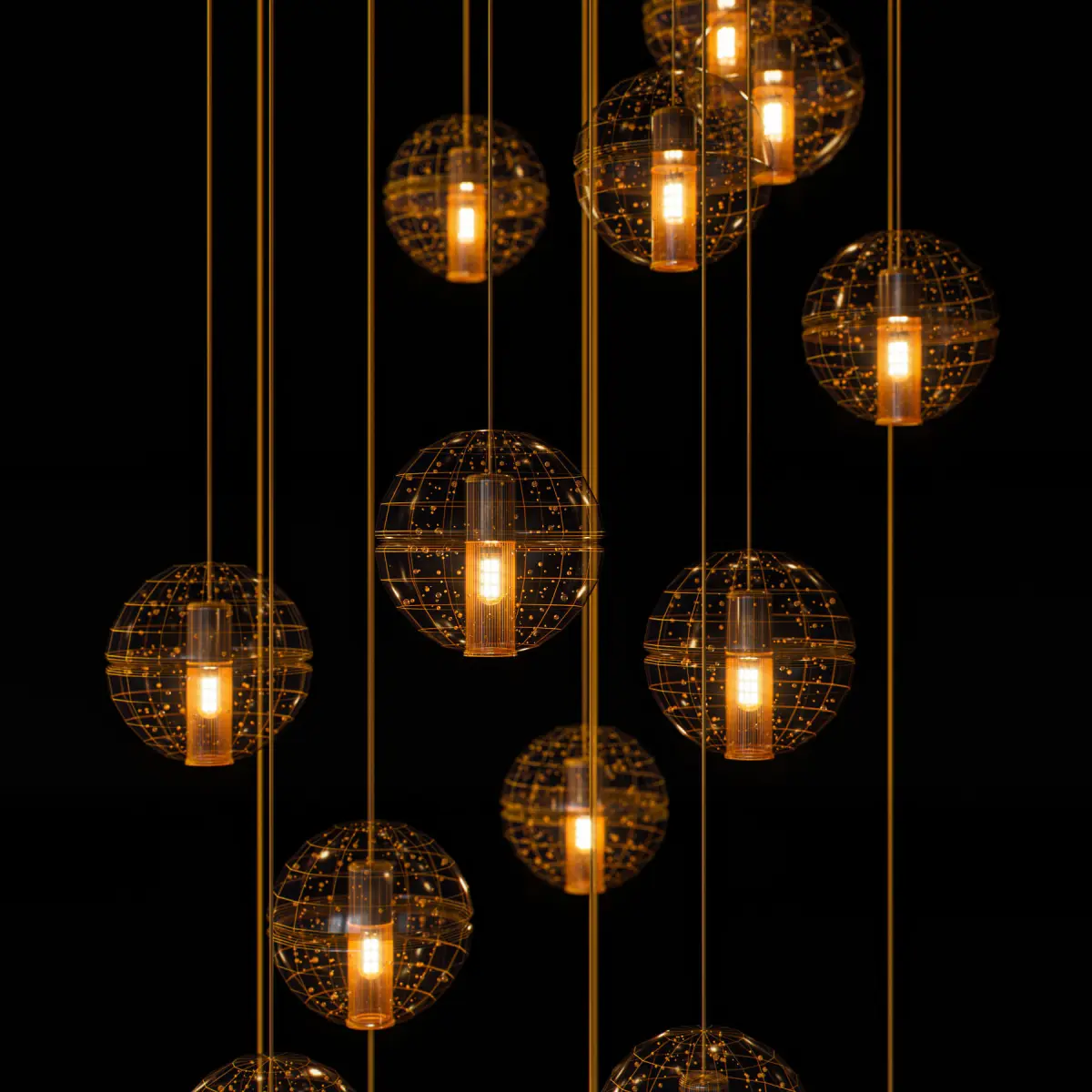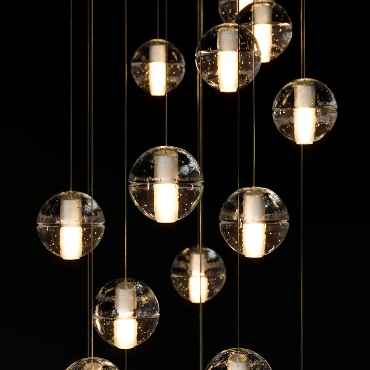 Series 14, designed by Omer Arbel in 2005.Series 14 is a cast glass ball with a horizontal seam in the center. Inside is a cylindrical void with a matte finish.The balls glow thanks to a low-voltage xenon lamp or led-lamps. Light interacts with bubbles of imperfect cast glass, which resembles small candles floating in spheres of water.