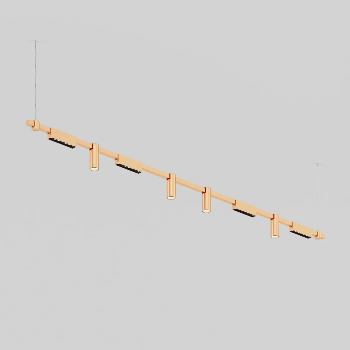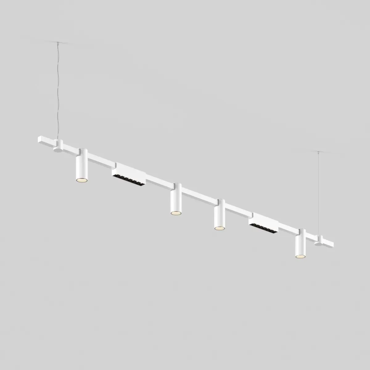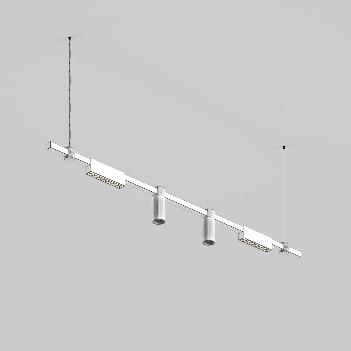 The lighting installation consists of a horizontal surface-mounted bracket and LED light fixtures. The series offers various configurations: Tube&LF and Tube&LS. The sleek cylindrical design of the fixture makes it visually lightweight and aesthetically pleasing in modern spaces. Pendants are included in the set. The recessed light source and special lens in the LS series provide a high level of visual comfort and eliminate glare. The linear type fixture has directional lighting without any glare on the ceiling. The new lenses create uniform illumination without halos or dark spots.