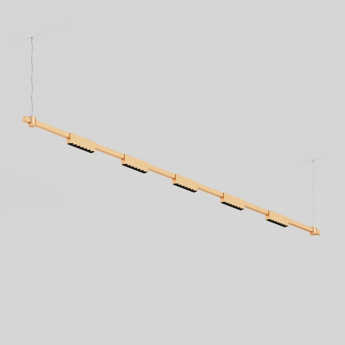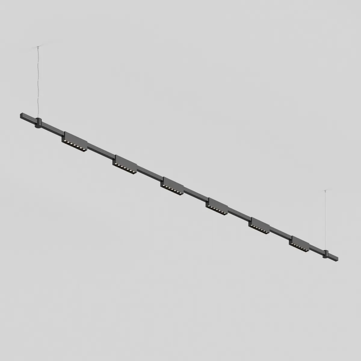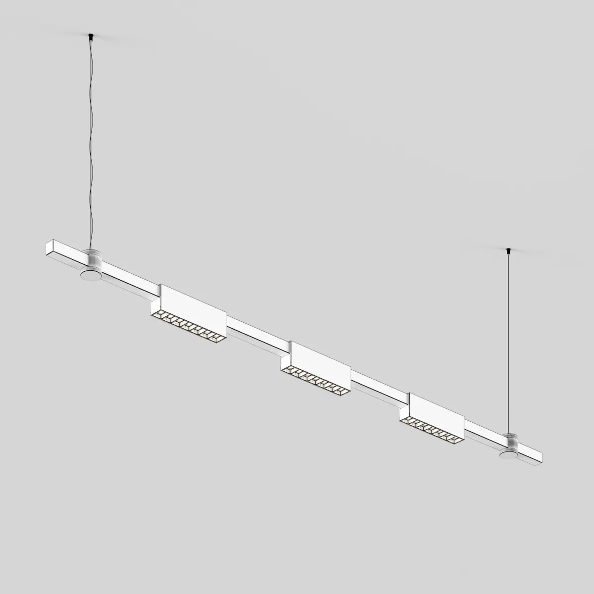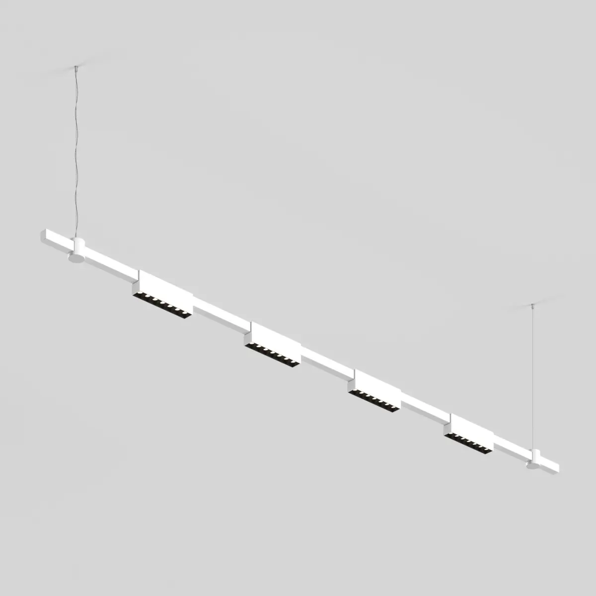 The light installation consists of a horizontal surface-mounted bracket and LED fixtures. The minimalist light line conceals a bright and modern light source. The linear fixture creates a calm diffused light. Modules with frosted diffusers and a wide 120° beam angle provide a high level of visual comfort and eliminate glare. Suspension cables are included in the kit.