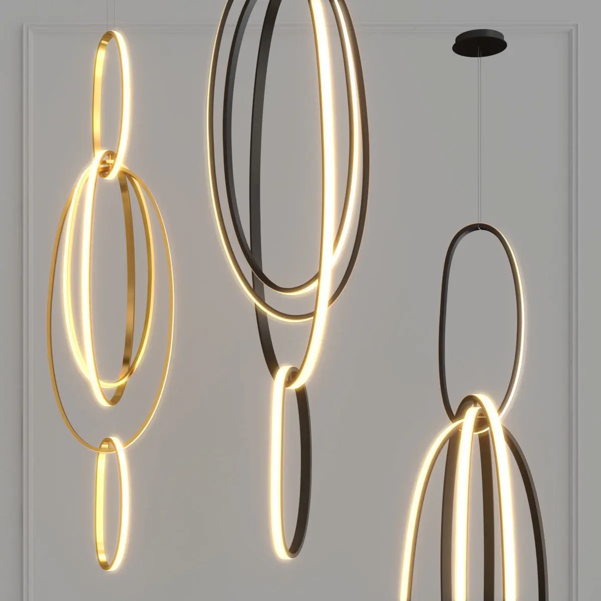 Подвесной светильник в виде композиции переплетенных металлических эллипсов — это элегантный и современный осветительный прибор, который станет центральным элементом любого интерьера. Благодаря уникальной форме, созданной из нескольких переплетенных эллипсов, светильник создает эффектный визуальный акцент и добавляет пространству динамику и изысканность.