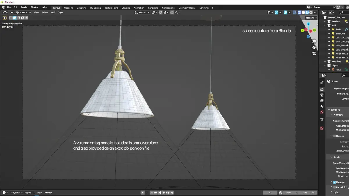 Includes a cone of fog or volume that enhances the appearance of light emmiting from the fixture. Included in some versions and also as a separate obj file.