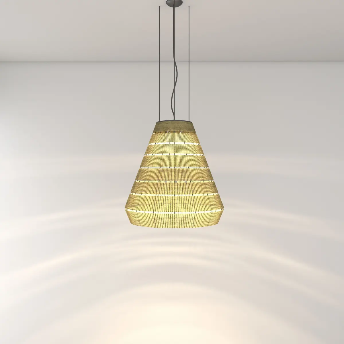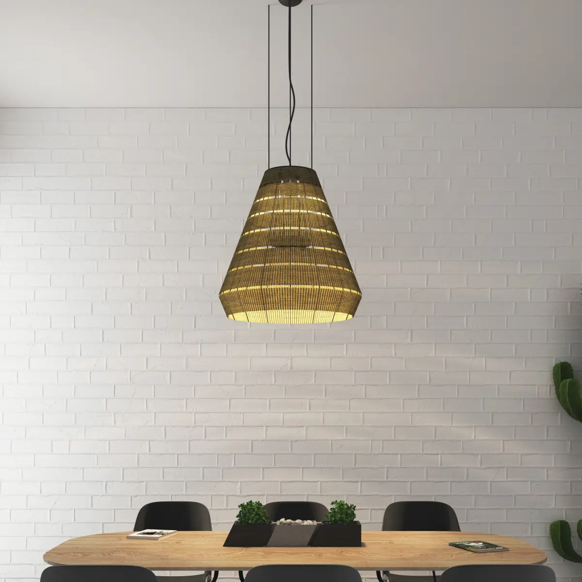Pendant light with a stylized shade giving ambient shadows in an interior space. The light fixture is detailed from wiring to base.