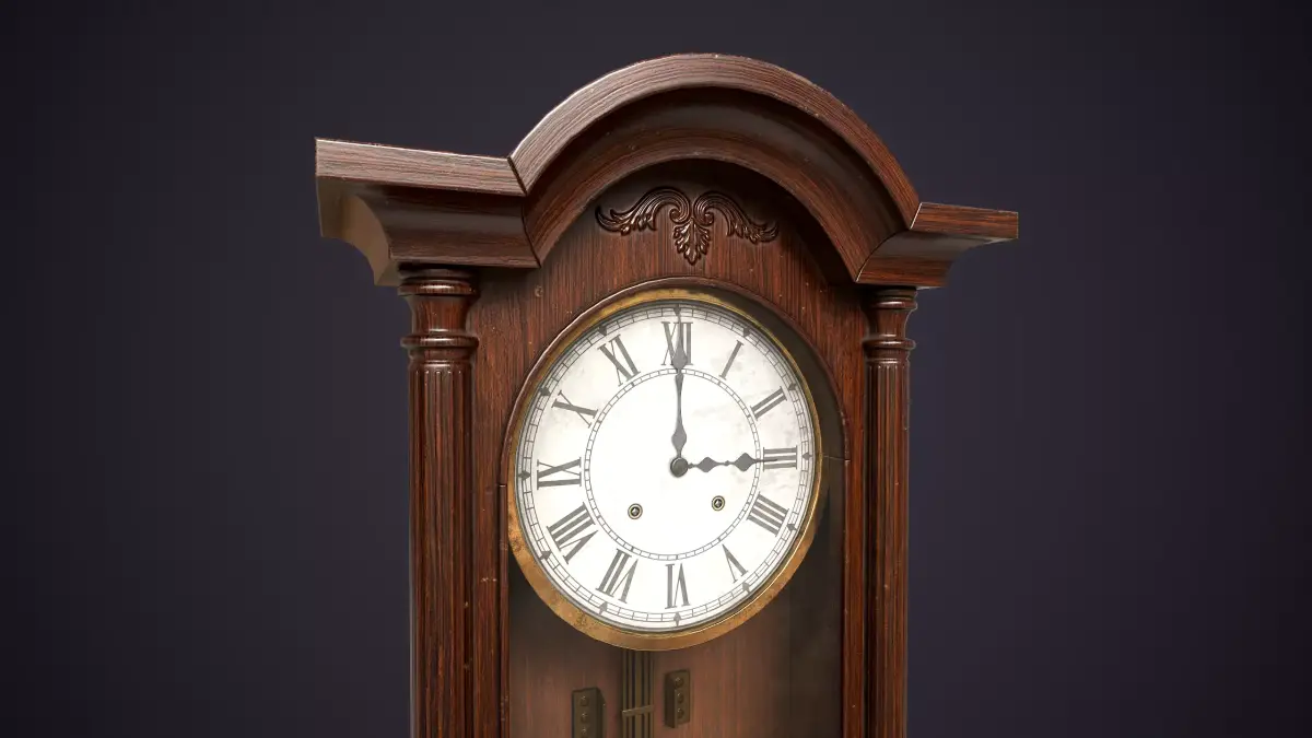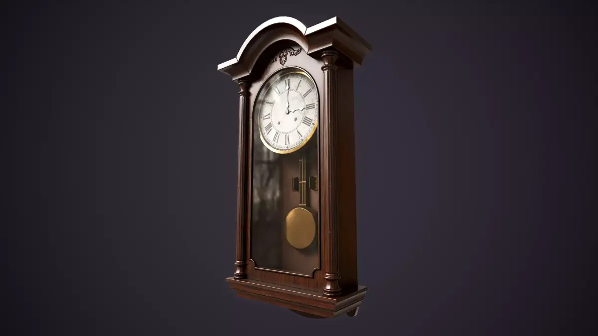 The clock hands and pendulum are separate objects, allowing for easy animation or adjustment. Suitable for various historical and vintage interior scenes.