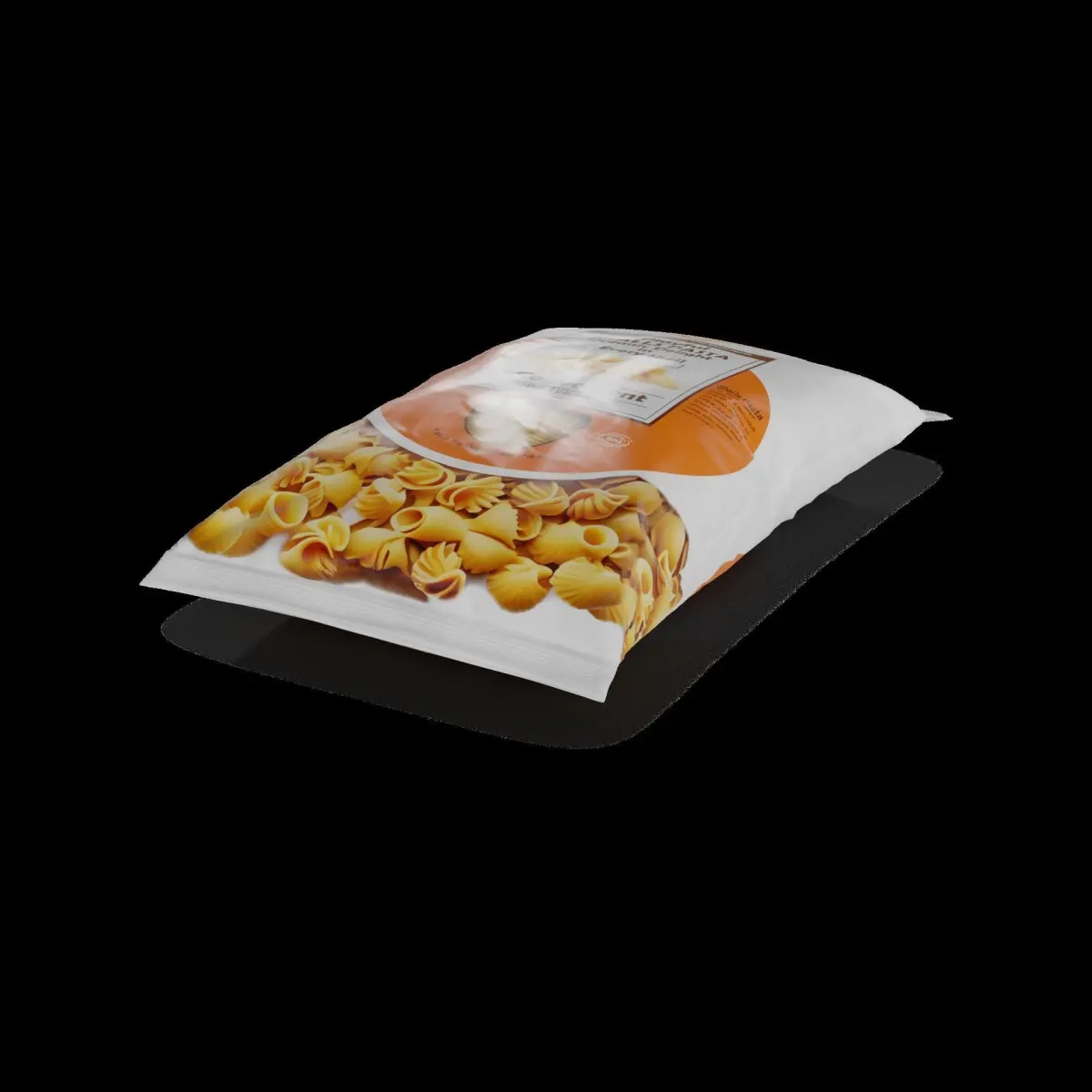 Shells Pasta: Our shell-shaped pasta is a fun and playful addition to any meal. Made from 100% durum wheat, these shells have a unique texture that holds onto sauces and fillings. The packaging is a sturdy cardboard box with a clear plastic window to display the shells. The label features a vibrant orange color scheme with a graphic of cooked shell pasta. It includes the text Made from durum wheat and Cooking instructions included. Size: 750g.