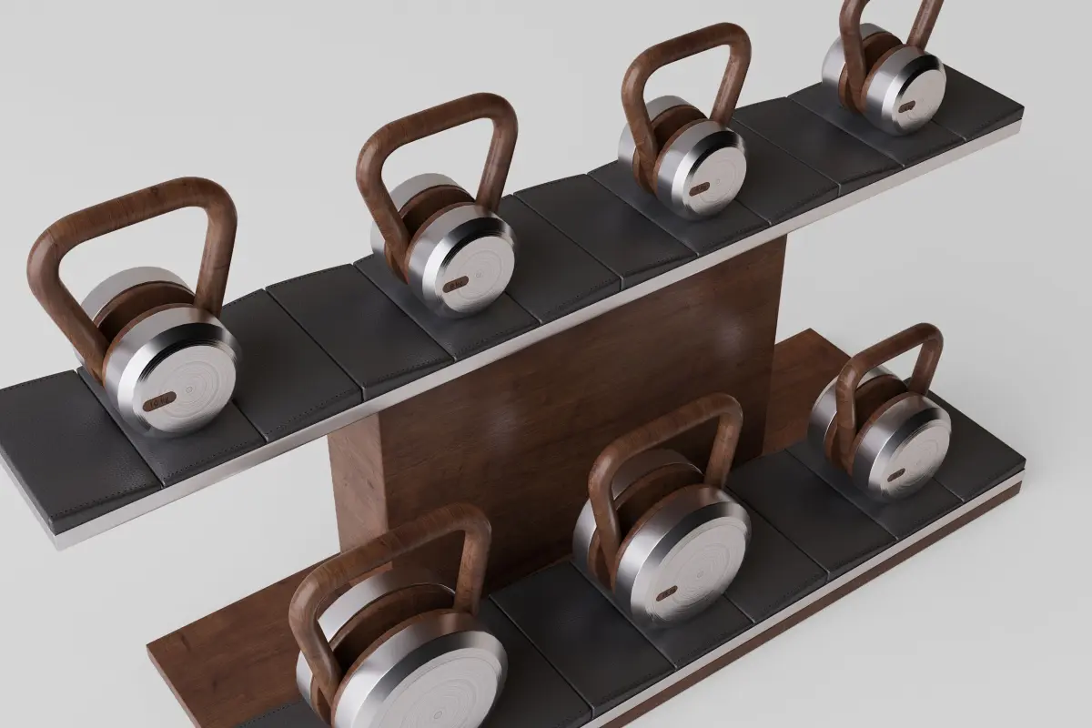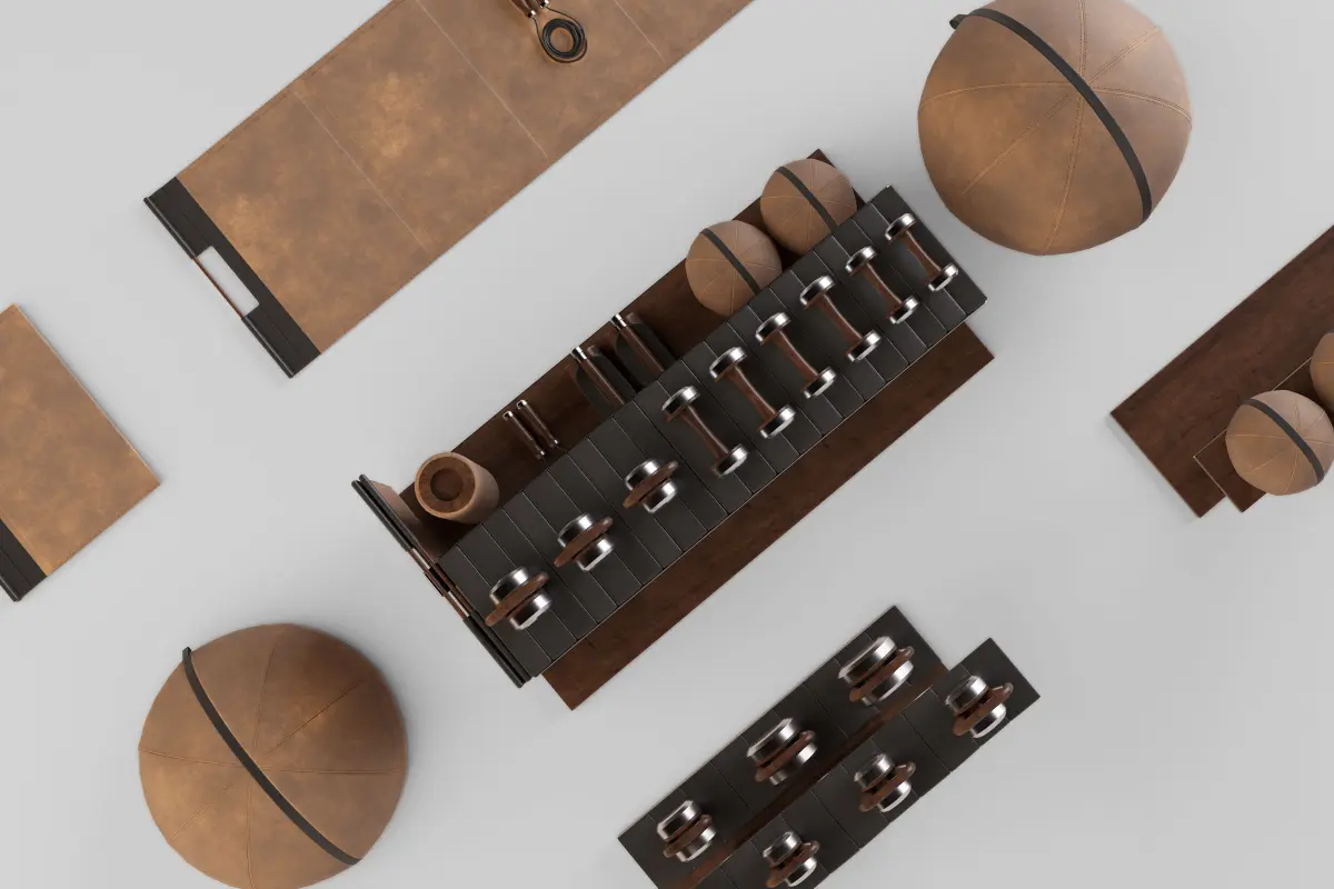 Elegant and photorealistic 3D model set inspired by PENT luxury fitness equipment. This collection includes a yoga mat, training rope, pilates ball, dumbbells, kettlebells, free weights, and more - crafted from premium materials like natural wood, polished chrome, and fine leather.