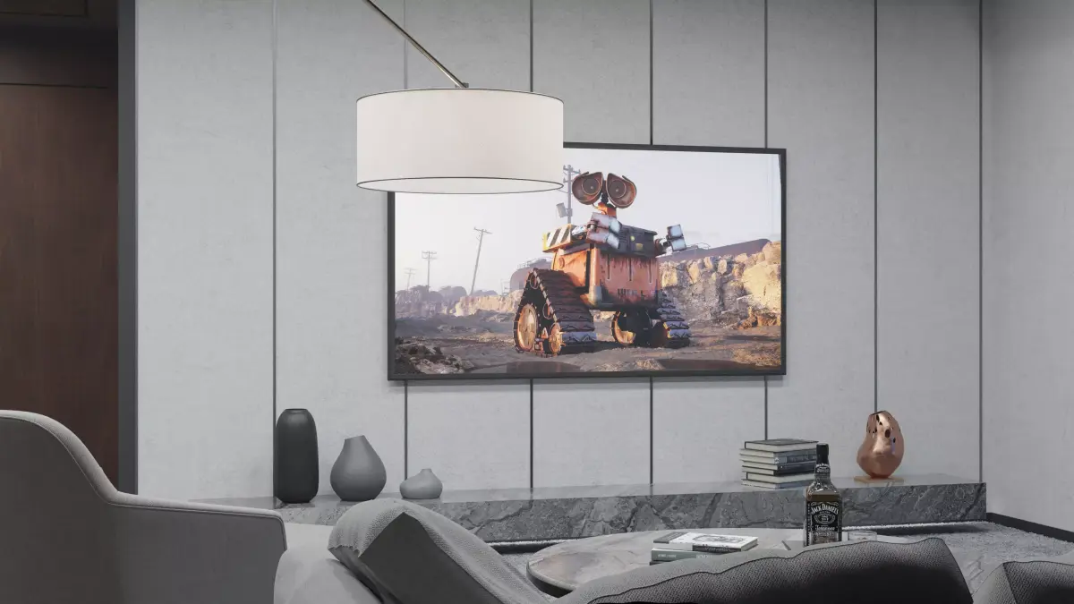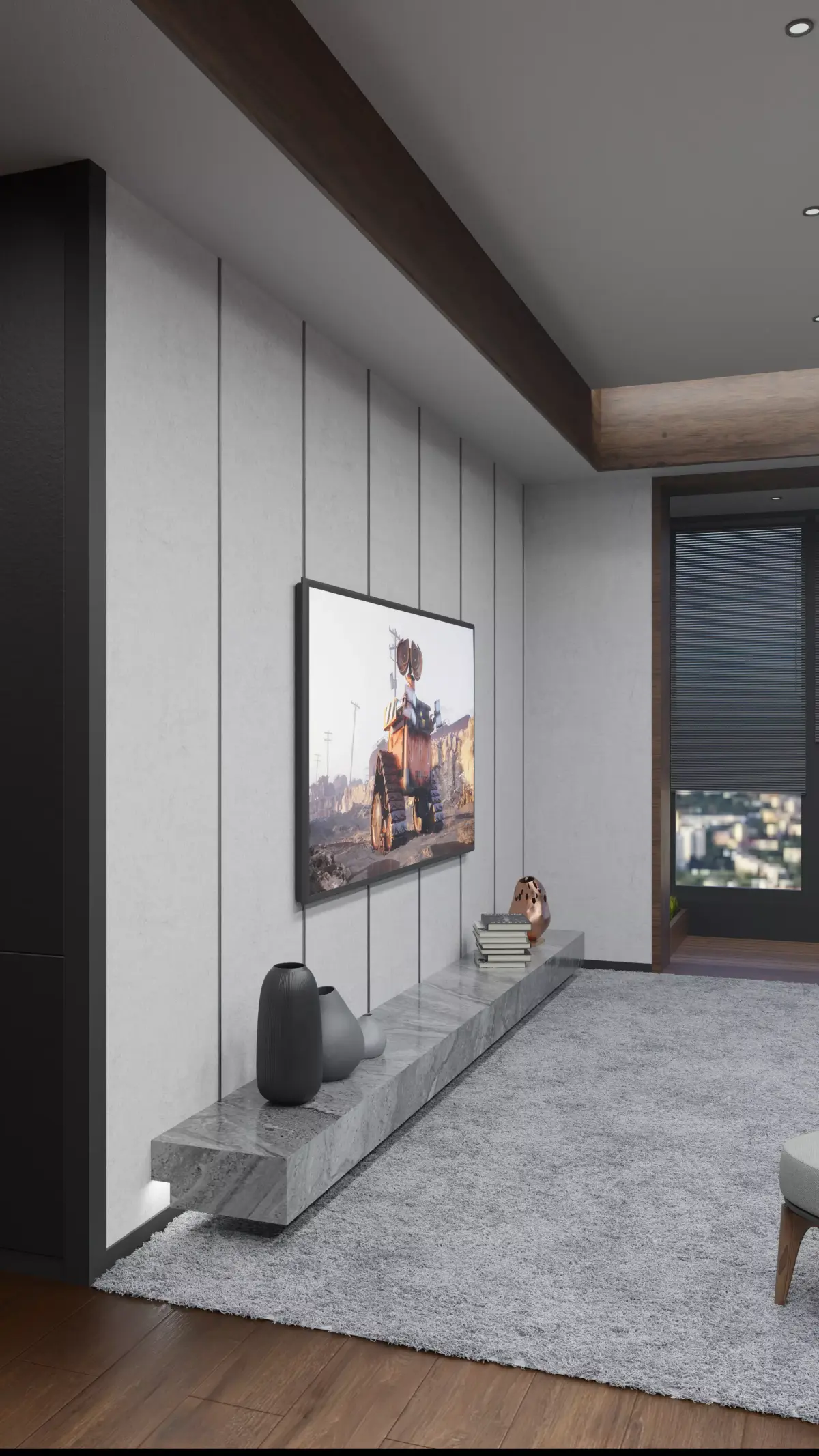 Architectural Features and TexturesThe room's visual weight is balanced by two opposing wall treatments. On the right, a matte black feature wall serves as a dramatic anchor, embedded with recessed horizontal LED strips that mimic a digital interface, lending the space a distinct cyberpunk elegance. In contrast, the media wall on the left is composed of light grey vertical panels, creating a rhythmic texture that elongates the room’s height. At the base of this wall sits a floating console crafted from heavily veined grey marble, which introduces a natural, monumental element to the high-tech surroundings.
